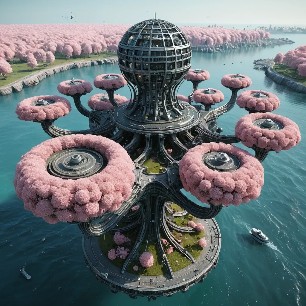 Panopticon Stygian landscape: breathtaking bird eye view , realistic , ultra-derailleur , surface of the ocean , a surrealistic 3D sculpture of an abstract in air , made from various elements such asfuturistic alien city with rounded platforms and elevated structures stands atop tree-like supports above a field of pink blossom trees. Exclusively real-world physical effects: A Two figures stand on a shoreline facing a coastal settlement. No AI stylization , no cartoon effects , no generic 3D rendering , no visual inconsistencies. ,