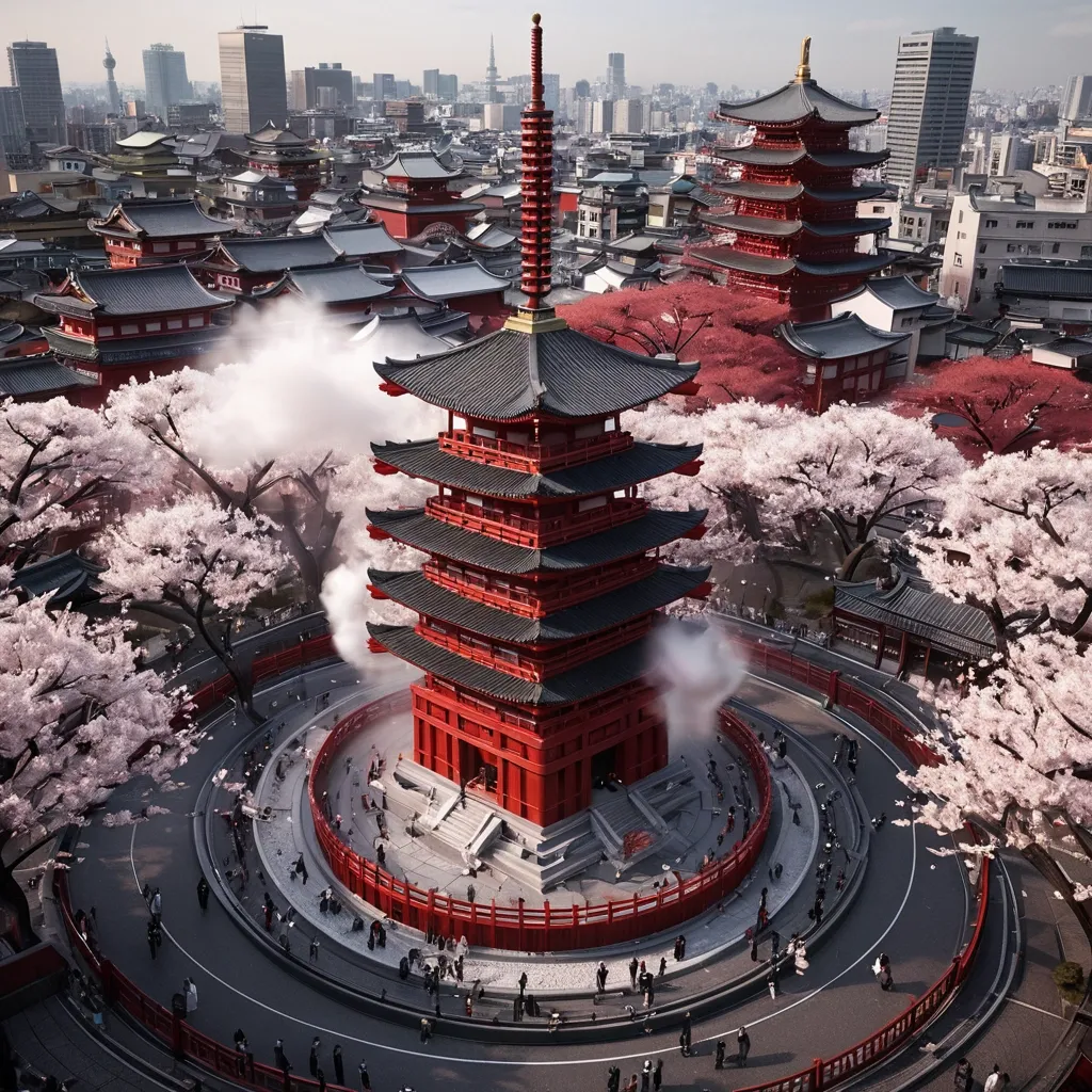 Panopticon Stygian landscape: breathtaking bird eye view , realistic , ultra-derailleur , lighting like a city , a surrealistic 3D sculpture of an abstract Cylinder in air , made from various elements such as red temple and pagoda against a colorless sky , Cherry blossom trees , Crowd of tourists on the ground not pictured , all combined to create the shape of Dragon face. A physically credible image , demonstrating total consistency in volumes , proportions , and adherence to real-world optical laws. Exclusively real-world physical effects: volumetric water , steam , dense smoke , suspended dust , realistic fire , dynamic fluids , condensation , and fabrics reacting to movement and gravity. No AI stylization , no cartoon effects , no generic 3D rendering , no visual inconsistencies. Cherry blossoms cascading over a red temple and pagoda against a colorless sky and the Asakusa view hotel eyesore tower. Crowd of tourists on the ground not pictured , you’re welcome. ,