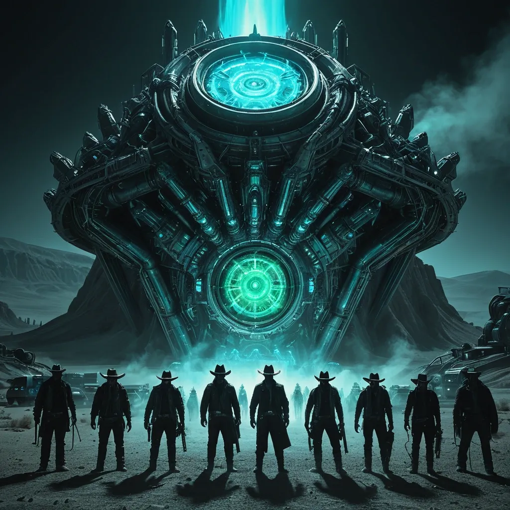Highly detailed cyberpunk eye rising from mountain , massive futuristic reactor with complex intertwined metal pipes surrounding it , central core emitting glowing blue energy , dense neon-green vapor pouring symmetrically from both sides of the machine. sand desert and in front a group of cowboys with their horses and guns , and in front of them is a group cowboy leader. cinematic lighting , dark and ominous mood , front-facing camera , perfectly symmetrical composition , ultra-realistic textures , high contrast shadows , cold metallic surfaces , deep atmospheric perspective. ,