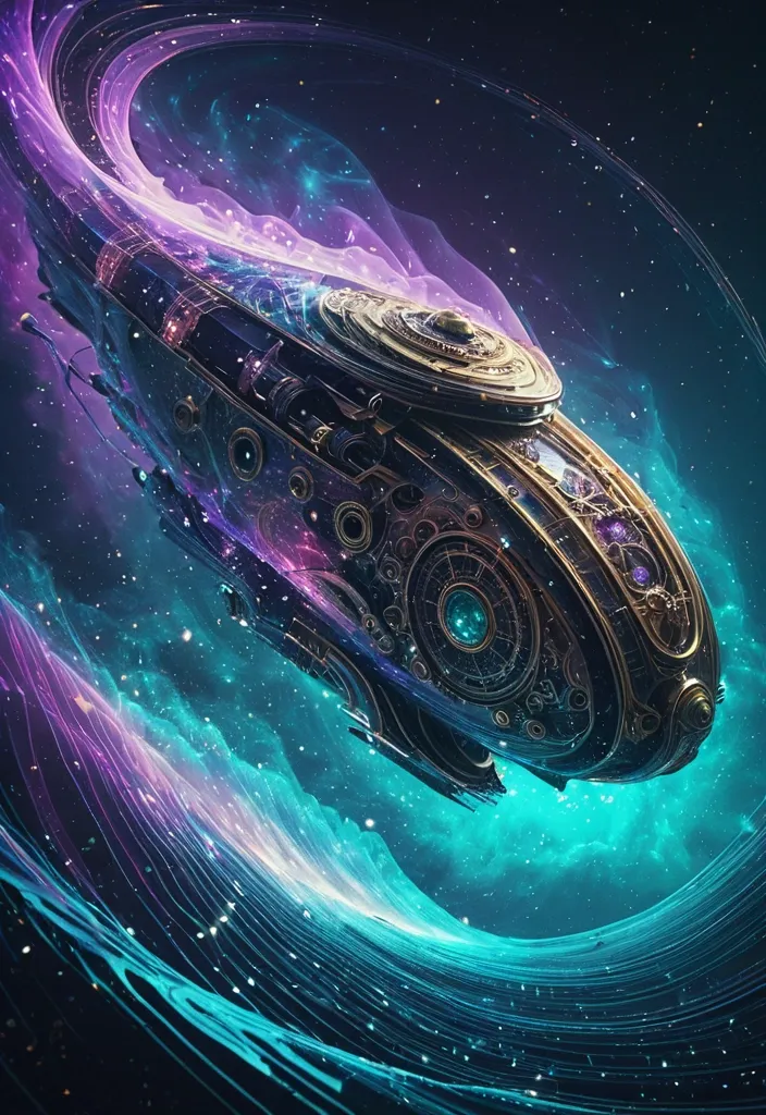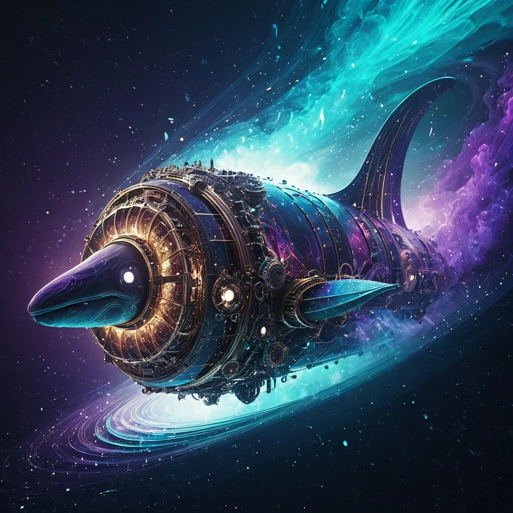 A flowing , Giant spacecraft , rendered in intricate clockwork and brass gears , swims through an abstract nebula of swirling digital data streams. The spacecraft bending into impossible angles , complex mechanism of interconnected parts , with glowing LED eyes peering out from the cosmic dust: electric blues , deep purples at the top and edge , shifting into bright cyan. The head tilts gently downward , defined only by subtle curves and shadows formed by the color transitions. perfect whale breaching a vast , calm ocean. Style: Celestial , ethereal , abstract , digital art smoking: Dramatic backlighting , bright glowing particles , contrasting dark background Composition: dynamic diagonal composition , upward gaze Details: Sparkling white waves and smoke , streaking white light trails , sense of movement and wonder , magical atmosphere Quality: High detail , 4K , Masterpiece , Rendered in Octane ,