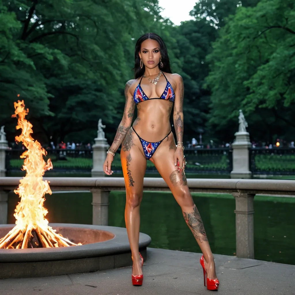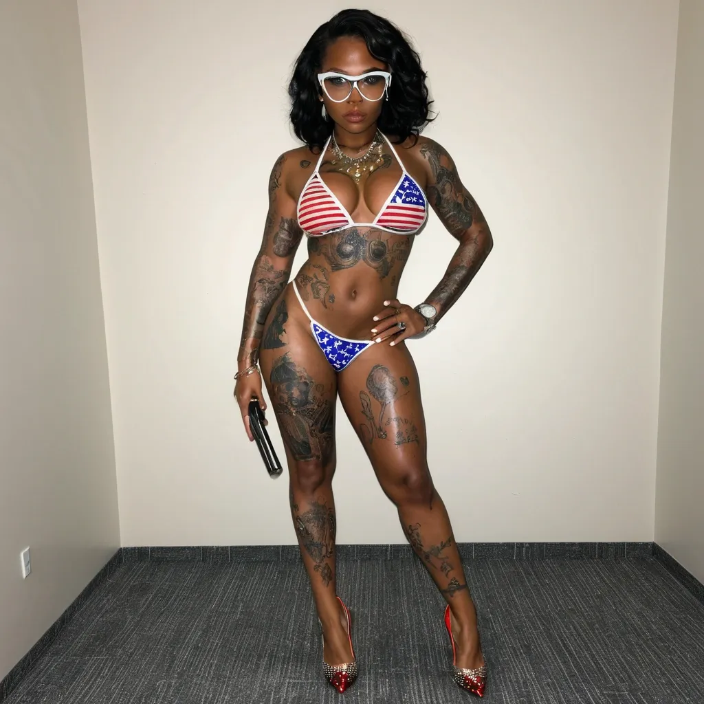 Stunning Dark-Skinned African-American woman radiating absolute power and futuristic dominance. - Face: Flawless deep ebony skin with a subtle luminous sheen , razor-sharp cheekbones , full glossy lips in a muted gunmetal-mauve shade , and perfectly sculpted brows that enhance her fierce expression. - Hair: Long , thick black braids gathered into a high , sleek ponytail that cascades down her back like a warrior’s banner , with the sides cornrowed tightly against her scalp for a clean , aggressive silhouette. - Body: Mind-blowingly muscular and statuesque — impossibly broad shoulders , cannonball delts , veiny biceps , a thick armored chest , and tree-trunk quads , all wrapped in glossy dark skin. The proportions are superheroic , almost mythic , with a tiny , corset-tight waist that defies physics. - Gorgeous hazel eyes: Piercing , glowing hazel-green irises that catch the light dramatically , intensified by the fiery orange lenses of her mask and long , thick lashes. - LO emblem on her chest: A bold , raised , metallic gold “LO” emblem centered directly on her massive , rounded chest plate , outlined in glowing orange piping that pulses faintly , like it’s powered by some inner energy source. - Pose: Frontal power stance , legs planted wide , fists clenched at her sides , shoulders squared , chin slightly raised — pure intimidation and readiness , every muscle flexed and on display. - Clothes: A skintight , high-tech black tactical bodysuit with armored segments , glossy like liquid obsidian. Dramatic orange-golden circuit-like lines run across the suit , accentuating every curve and cut of muscle. Heavy armored gauntlets and reinforced shoulder pads complete the battle-ready aesthetic. - Beauty: Devastatingly beautiful in an overwhelming , goddess-of-war way — the combination of soft , regal facial features with an ultra-jacked , hyper-muscular frame creates a breathtaking contrast of feminine elegance and raw , unstoppable strength. - Mask: A sleek , futuristic half-mask in glossy black with glowing orange accents that frame and intensify her eyes , giving her an almost cybernetic predator vibe while leaving her lower face exposed to show her fierce expression. She looks like the ultimate superheroine straight out of a high-budget sci-fi epic — unapologetic , invincible , and drop-dead gorgeous. ,