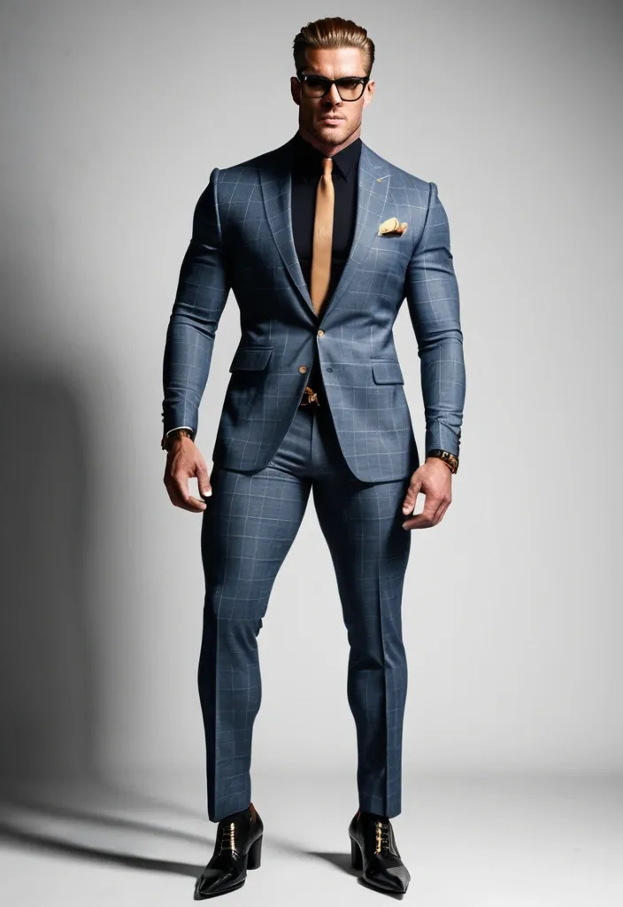 Generate 21 year old man he is suave snd a pretty boy handsome Caucasian man abnormally massive male bodybuilder , eye glasses , close up , full lips , big booty , black trimmed coarse hair , big , blonde hair , pomade slick back , muscular man , big gorgeous blue eyes , he is clean shaven , smooth face , strong jawline up close , flexing biceps , gorgeous brown blue , legs are iconic and defining physical feature , both visually and in terms of combat ability.wearing an outfit that is a striking blend of suaveness , power , and alpha male indulgence , designed to command attention in any room. The suit is tailored to perfection , hugging the wearer’s manly physique with precision while emphasizing a structured silhouette. The fabric itself is a refined grey tweed patterned with subtle white grid lines , giving the suit a texture that feels both sophisticated and modern. The blazer features broad blue lapels and gold button accents , adding a luxurious touch that elevates the look beyond typical business attire. The matching trousers elongate the frame , further enhancing the poised and commanding effect of the ensemble.The styling choices amplify the boldness of the suit. The inner shirt is a silky , grey button-down shirt that complements the tweed’s tone while introducing a masculine balance to the sharp tailoring of the jacket. The shirt peeks out neatly from under the blazer , maintaining elegance without drawing focus away from the suit’s commanding cut. Accessories are kept minimal yet intentional: a delicate layered gold necklace ad alpha leader of light and luxury without overpowering the outfit completing the commanding visual.Altogether , this look communicates a blend of authority and allure. It is business-ready yet fashion-forward , balancing corporate structure with masculine swagger . The color palette blue , grey and gold avoids being overly delicate , instead embracing the richness of texture , structure , and presence. This is the kind of ensemble that speaks to ambition , sophistication , and personal style—ideal for someone who thrives in positions of influence but insists on expressing hid individuality with bold elegance. It’s not just clothing—it’s a statement of power wrapped in mojo. In luxury living legs that could crush a watermelon , chest like boulders are a bold , crafted in glossy black patent leather that gives them a sleek , polished finish. Rising to just below the knee , the shoes feature three adjustable buckle straps along the shaft , adding both edge and detail to their design. The towering males , creates an ultra-dramatic masculine silhouette that elongates the leg and exudes power and confidence. With their combination of shine , height , and structure , his lean body perfectly balance fierce masculinity with high alpha male allure , black t-shirt and jeans , up close shot ,