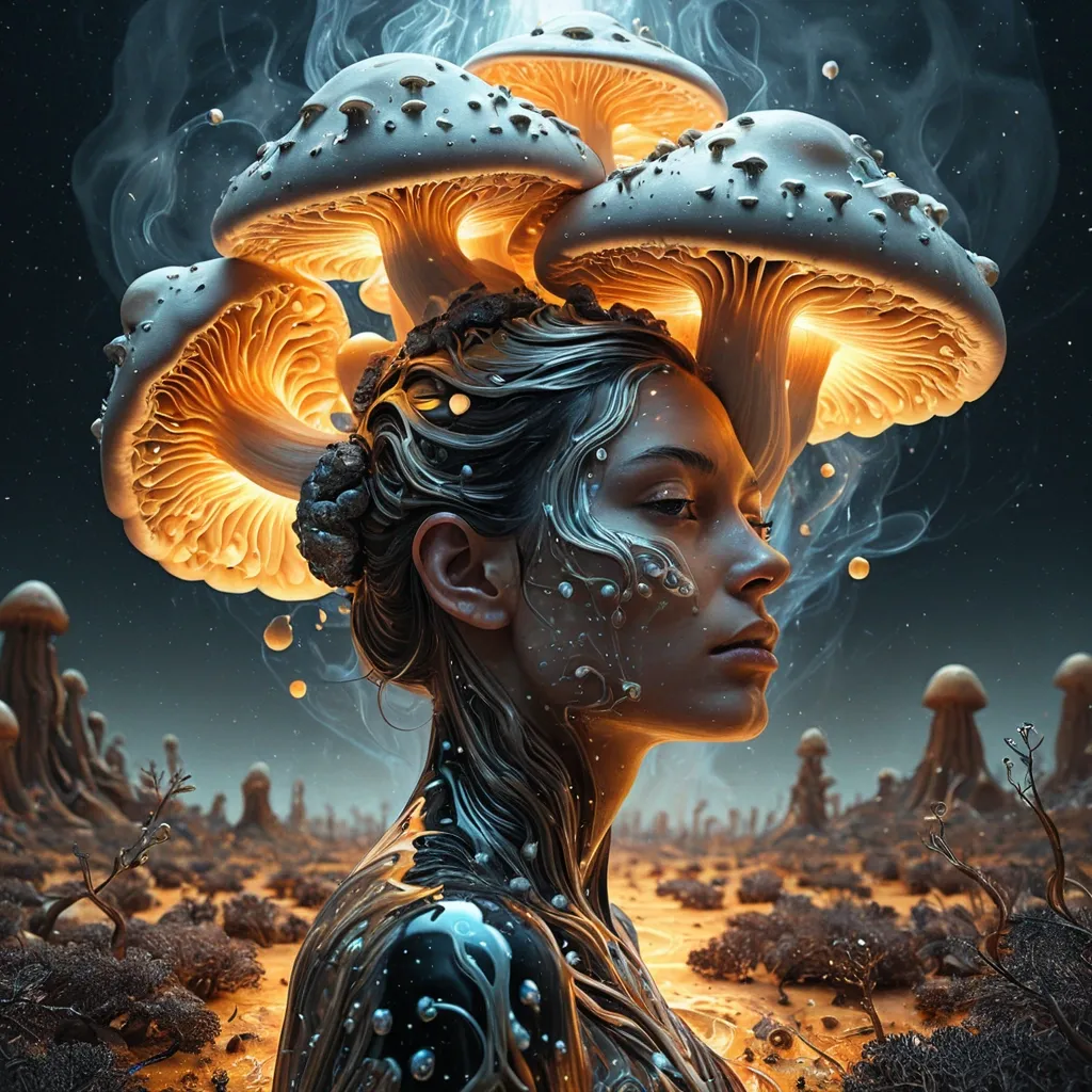 Visualize a surreal desert illuminated. At the center is a side full body profile of a woman with a photo-realistic face resembling an actual animal. Starting from her head transitions into a mushrooms on top of a bare plant in a winter land. This mushroom , densely packed with leaves , vivid liquid ink , nickel and silver , elaborate and intricate ink illustration golden hour made of infinite light , thought-provoking. Style: deeply spiritual Sci-fi art , reminiscent of digital hyper-realism combined with cosmic impressionism. Focus on intricate detail of black and smoke in vortex flow , with epic cinematic lighting and a dramatic , painterly texture. ,