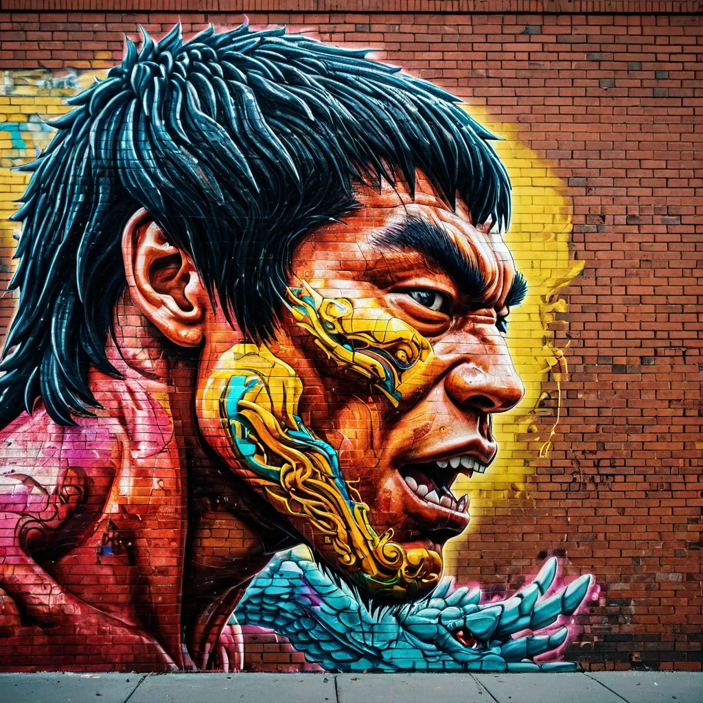 graffiti artwork on the side of a brick building , dynamic Bruce Lee scene , science of detailed defined vivid side profile shot of head of dragon created by fist punch with dragon special effects biomechanics elements , digital masterpiece , random textures glistening , vibrant colors contrasting against the metallic background , high depth , exhilarating ambiance , random intensely vivid tones , capturing the essence of movement and adventure in martial arts. ,