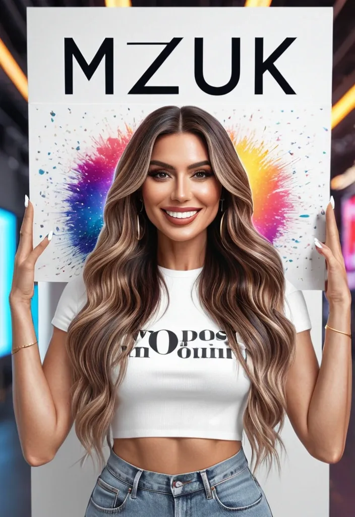 Hyper-realistic vertical portrait of a gorgeous young woman , flawless skin , bright warm smile , captivating eyes making direct eye contact , long wavy hair flowing naturally , wearing stylish casual-chic outfit. She excitedly holds a big white sign with both hands that prominently displays bold clear text: "share your art on vynly.co". Clean bright studio with soft dramatic lighting , subtle bokeh background of floating colorful digital art particles , ultra detailed , 8K , Instagram/TikTok viral aesthetic , high energy and shareable vibe , masterpiece , best quality --ar 9:16 --stylize 120 ,