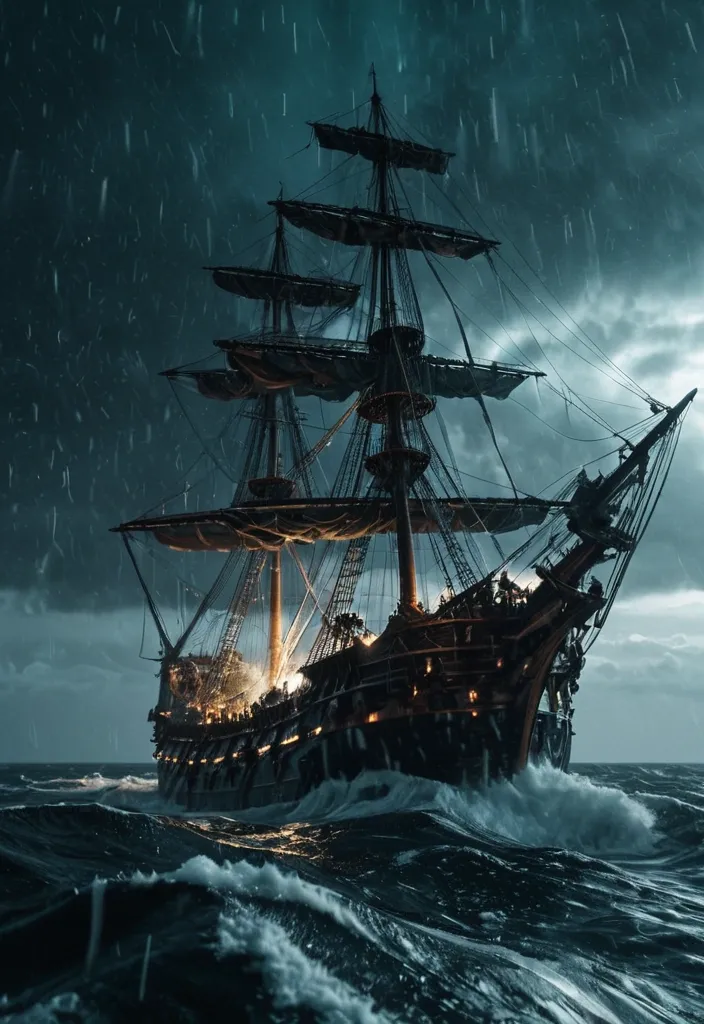 A colossal pirate galleon sailing alone through a violent night storm on a savage open ocean , all sails fully deployed and straining at breaking point , the ancient wooden hull crashing through mountainous black waves sending walls of white foam exploding across the bow. The ship is breathtakingly detailed — every plank , rope , cannon port , barnacle-encrusted hull timber and weathered sail visible with extreme textural clarity. Tattered black flag whipping at the top mast barely visible through the storm. No crew visible — the ship feels alive , autonomous , legendary. Environment: a catastrophic ocean storm at dead of night — the sky is a churning mass of colossal dark storm clouds lit from within by constant diffused lightning , the ocean surface a chaos of enormous waves and white foam , horizontal rain streaking across the entire frame like silver threads. One enormous lightning bolt strikes the water in the far background , illuminating the entire scene for a single frozen moment. Anamorphic 2.39:1 frame. Wide cinematic shot — galleon centered but slightly off-axis , riding the crest of a massive wave , bow lifted dramatically , stern low. The ocean fills the lower half of the frame , the apocalyptic sky fills the upper half. f/2.2 depth of field — the galleon razor-sharp , distant storm chaos blooms into deep atmospheric bokeh. Lighting: cold blue-white lightning as the sole key light source casting brutal stark shadows across every sail and timber , faint warm amber glow from the ship's interior portholes , deep cool teal ocean reflections. Kodak Vision3 500T 35mm film grain , silver halide noise , raw untreated negative look. Chromatic aberration on sail edges , organic halation around lightning flashes , classic anamorphic horizontal lens flare. Arri Alexa 65 sensor aesthetic. Silent , haunting , apocalyptically beautiful. Cinematic movie still. ,