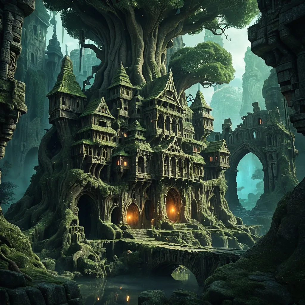 A forgotten city nestled within the roots of a colossal , ancient tree. Buildings are organic , carved from wood and stone , connected by glowing moss bridges. Whispers of magic fill the air , with ethereal spirits visible among the ancient architecture. The aesthetic combines folklore-inspired fantasy with a touch of melancholic beauty. Rendered in the style of a classic fairytale illustration with a cinematic , muted color palette. ,