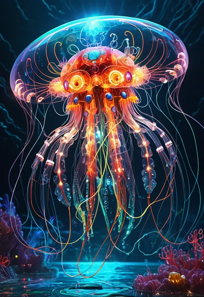 In the style of Psychedelic art and Joyride) , a crystal and glass bio-mechanical cyborg jellyfish with glowing electrical cables and colorful wired electrical wings with a blazing mane and shimmering feathered wings flies over a translucent underwater ocean teeming with multicolored fish , with stormy water in the background and a glowing red waves , ,