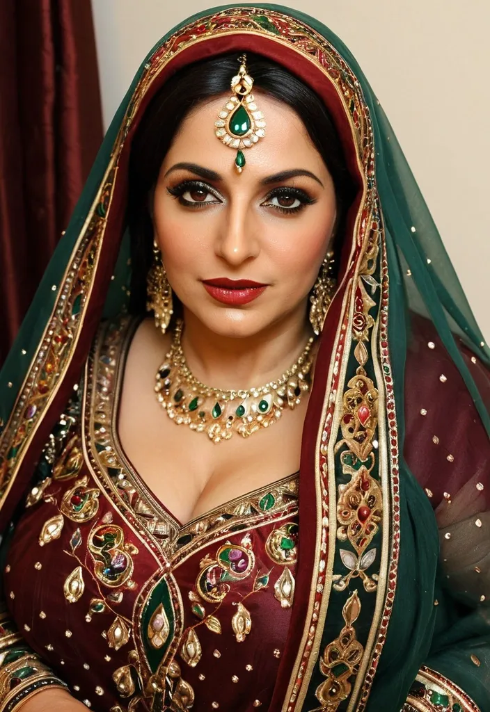 A arabic mature queen , Her hair is long , dark , and lustrous , partially visible beneath the elegantly draped dupatta that adorns her head and shoulders , respecting her transnational heritage. The dupatta , a piece of fine , lightweight fabric , is richly embroidered with traditional palace motifs , incorporating colors like deep reds , vibrant greens , and golds , symbolizing the richness of her culture , voloptuous , slight fat , red lips , gigantic_breast , mature , beauty , perfect face , perfect eyes , hd makeup , shimmery makeup , Saree , perfecteyes eyes , photo of perfectness eyes , ,