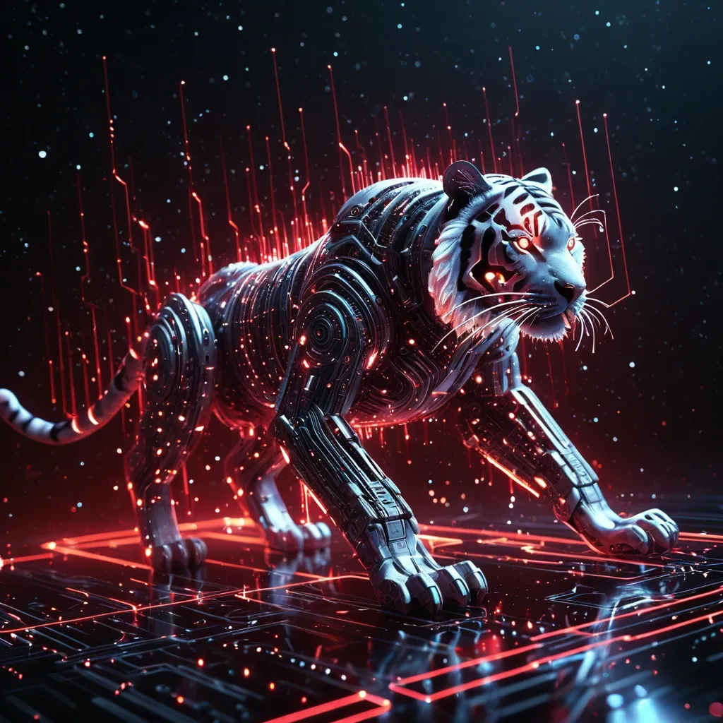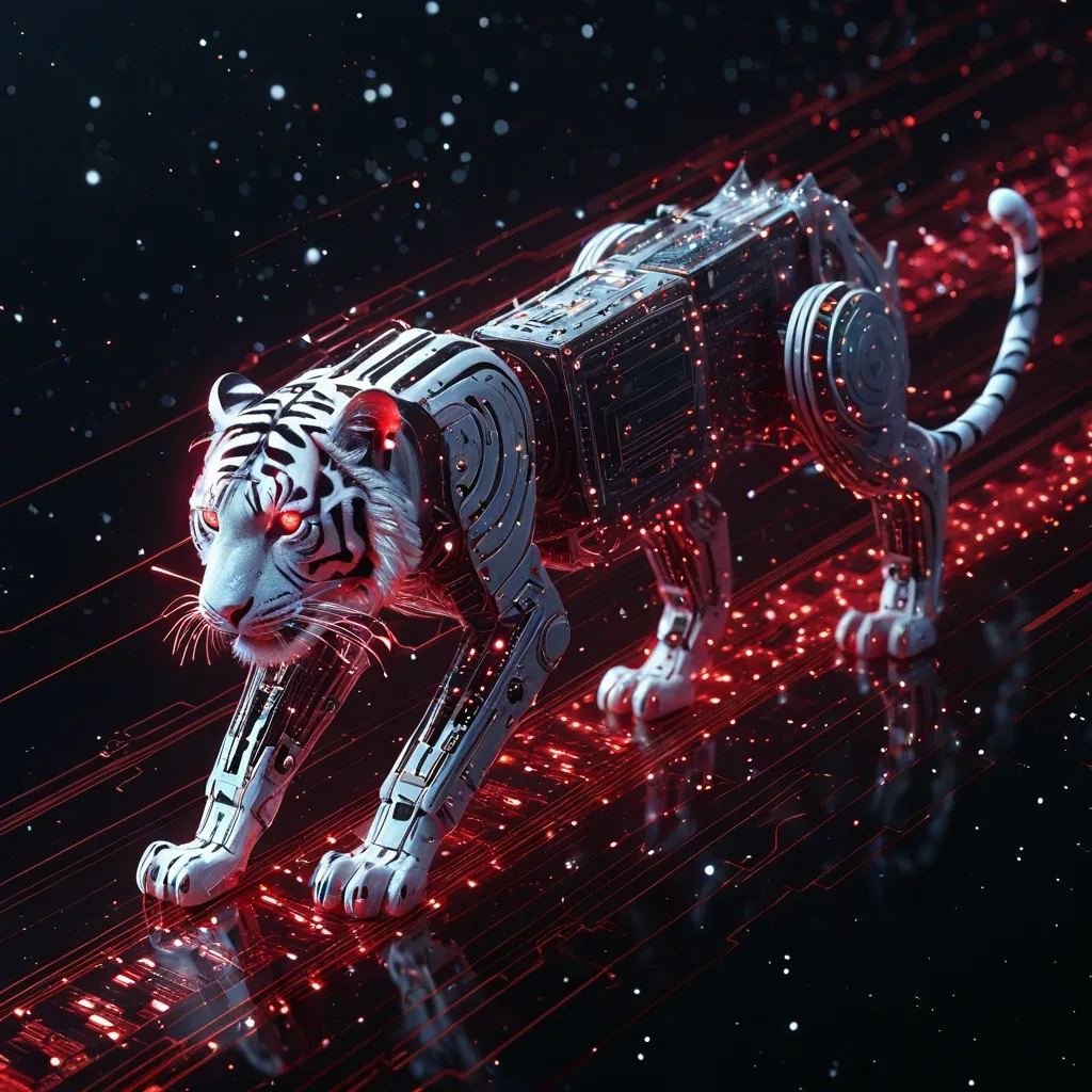 A tiger spacecraft composed of circuit paths , motherboard texture with glowing LED elements , silver traces forming a legs , quantum processor eyes , color scheme of crimson red and metallic black , floating binary code. Style: Celestial , ethereal , abstract , digital art black Lighting: Dramatic backlighting , bright glowing particles , contrasting dark background Composition: dynamic diagonal , composition , upward gaze Details: Sparkling dots waves and smoke , streaking white light trails , sense of movement and wonder , magical atmosphere Quality: High detail , 4K , Masterpiece , Rendered in Octane , ray traced rendering --ar 4:5 --raw --v 8 ,