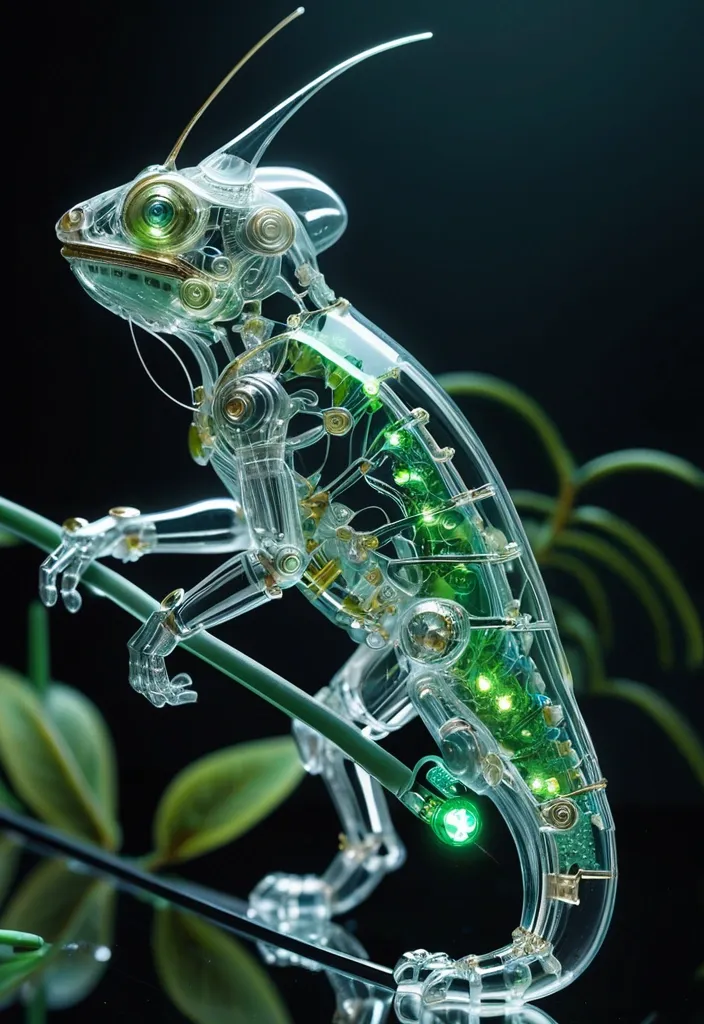 Create a hyperrealistic macro photograph of a transparent cybernetic chameleon perched on a flowering branch , its body positioned diagonally across the frame from upper left to lower right. Its exoskeleton is sculpted from clear , glass-like polymers , revealing a mesmerizing inner world of green glowing micro-LEDs , nano-scale circuit boards , and ultra-fine mechanical filaments. Intricate gold , silver , and chrome-plated components are embedded throughout its body , reflecting ambient light with refined metallic sheen. Employ stylish soft cinematography lighting to emphasize internal glows , crystalline reflections , and elegant light refractions. The composition should showcase clean lines and precision-engineered aesthetics-strictly high-tech , with no organic textures. A minimal city garden background paired with a shallow depth of field enhances the sense of scale , while delicate bokeh adds atmosphere and draws focus to the shimmering , futuristic anatomy. ,