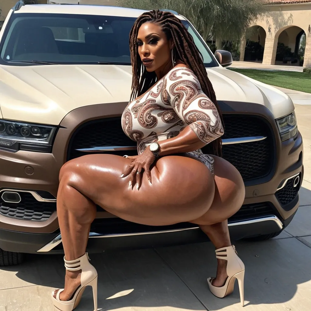 Gorgeous female boss , too big breast , stunning woman , stacked , enormous breast dark-skinned African-American woman , gorgeous brown eyes , 42 years old , abnormally massive female bodybuilder , gorgeous , close up , full lips , big booty , brown , hair , small waist , feminine silhouette , too big breast , beautiful brown eyes , dreadlocks , big booty , curvy hips , toned legs , legs that could crush a a cement block , flexing biceps , sitting in car , up facing the camera , She’s wearing a long , elegant paisley-patterned dress paired with a cream-colored buttoned cardigan , giving her a soft , cozy , bohemian feminine style. , enormous butt , massive breast , big round booty , legs crosses , muscular legs ,