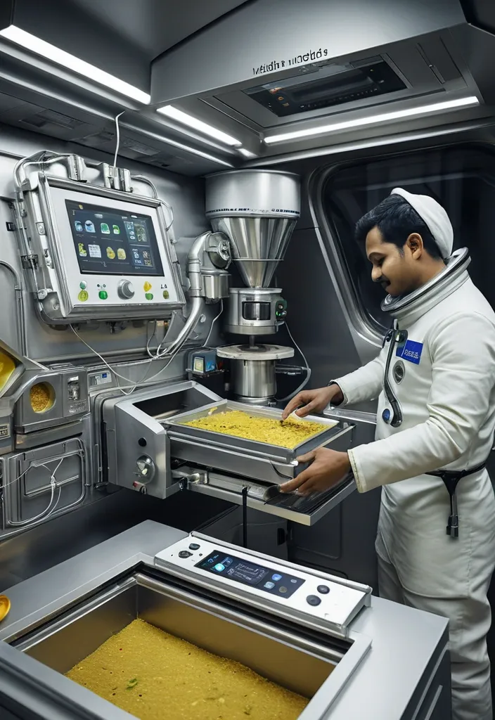 Inside a cramped , humming module of a lunar base , an astronaut is carefully tending to a samosa maker automatic digital machine , filled with vibrant , intricate holographic interface displaying complex samosa proccesing cartography. The scanner emits holographic monitoring data that showcases real-time food ingredients (Key ingredients include flour , ghee/oil , carom seeds (ajwain) , potatoes , green peas , cumin seeds , ginger , green chilies , coriander powder , dry mango powder (amchur) , and garam masala) statistics and insights above the machine , automates samosa ingredients tracking and gives you actionable insights to cut costs , reduce CO₂ , and boost efficiency , without changing how female kitchen works. The background is a sleek , minimalist command center , hinting at advanced technology and vast cosmic knowledge. The aesthetic combines the precision of 3D architectural rendering with the mystique of surreal landscapes. ,