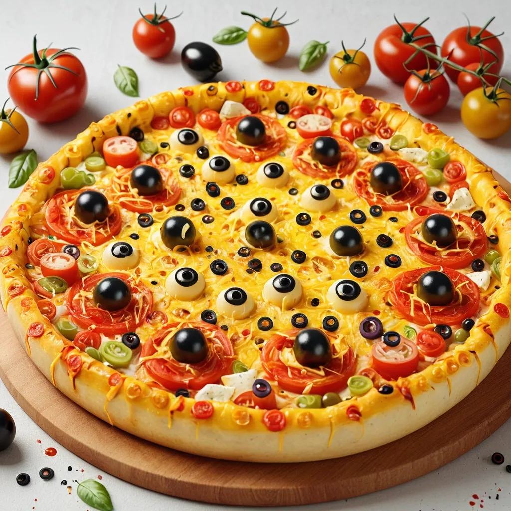 Представь себе яркую мультяшную сцену: круглая пицца с аппетитно выпирающими кусочками , покрытая разноцветным сыром , сочными помидорами и ароматными базиликом и оливками. Корочка слегка золотистая и хрустящая , а соус краснеет сквозь сырные нити. Вся сцена выполнена в 3D-технике , создающей ощущение объема и глубины , словно ты можешь протянуть руку и схватить кусочек прямо с экрана! ,