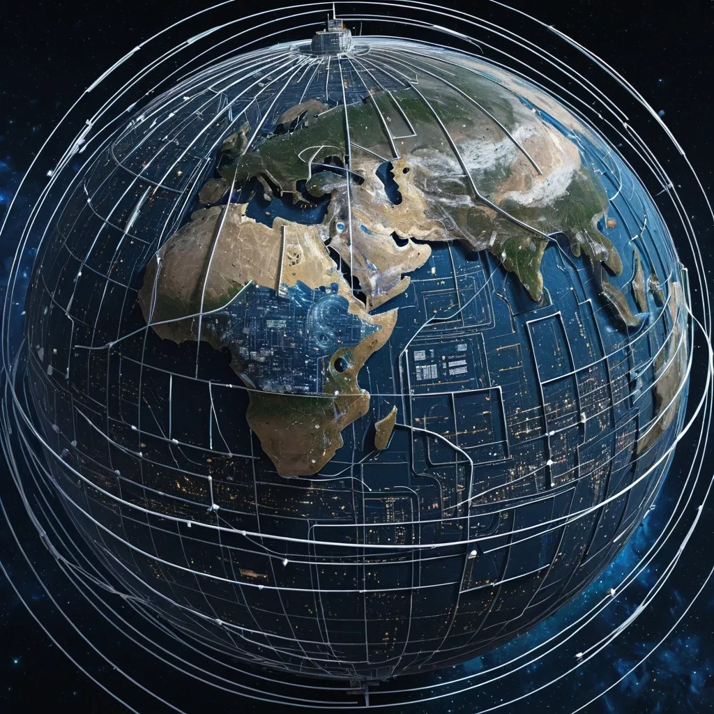 змнной шар в космосе в ширину всего листа , земля со стороны России , несколько спутников связи , линии волн , земля покрыта печатными микросхемами которые сходятся на процессор в центре каринки , на нем большой комплекс космической связи , гиперреализм ,