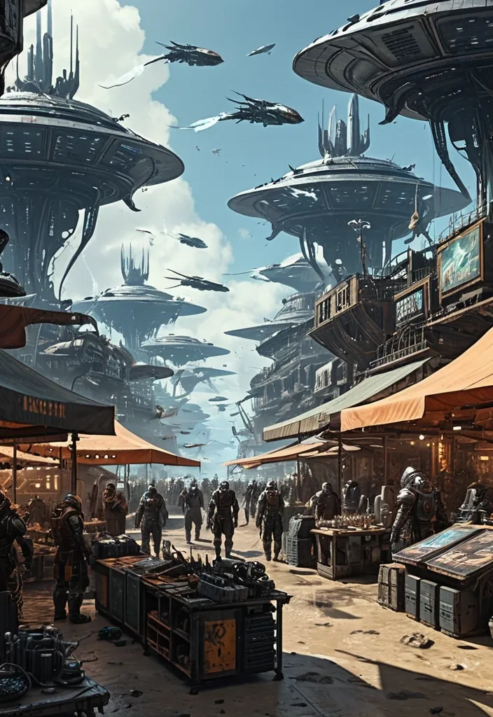 Можешь создать высокодетализированую концепт иллюстрацию. Футуристический рынок на планете где большую часть занимает океан. Атмосфера солнечного дня пара и дыма. Множество торговцев в различной броне , одеждах. Некоторые в рванном трепье. Киборги. И различные инопланетные виды продающие свои технологии. Мелкие летающие дроны. Сочетание примитивных и высоких технологий. Что то в стиле таких художников как Craig Mullins и Vadim Kashin ,