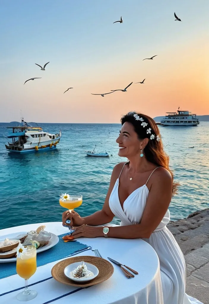 вечер , закат , море лазурного цвета , бриз , в море скала , вдалеке рыбацкие лодочки , над морем летают чайки песчаный берег , на берегу стоит столик , за которым сидит молодая , красивая , белокурая девушка с маргариткой в волосах , в белом сарафане , загорелая , на ноках сандали в греческом стиле , в руке у нее бокал коктейля Маргарита , а на столе чашечка восточного кофе. Девушка чувствует себя расслабленной , отдохнувшей , умиротворенной , на губах легкая улыбка , девушка смотрит на море. Картинка должна быть естественной. Размер картинки 9 на 15 ,