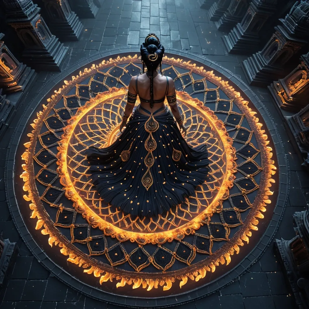 Masterpiece , aerial perspective , top-down view , grand scale , a model with an elaborate , braided black hairstyle that mimics the form of a majestic , a hairstyle spiral outward in all directions , with tiny , twinkling stars embedded within , head in frame. She is adorned in their designer Indian traditional Saree dissolves into an explosion of colorful , standing on a seamless street bathed in soft moonlight. Her expression is wise and powerful , radiating ancient wisdom. Dark fantasy concept art , detailed matte painting , dramatic lighting , intricate details , 8k resolution , trending on Artstation , inspired by the styles of Brom and Frank Frazetta. ,