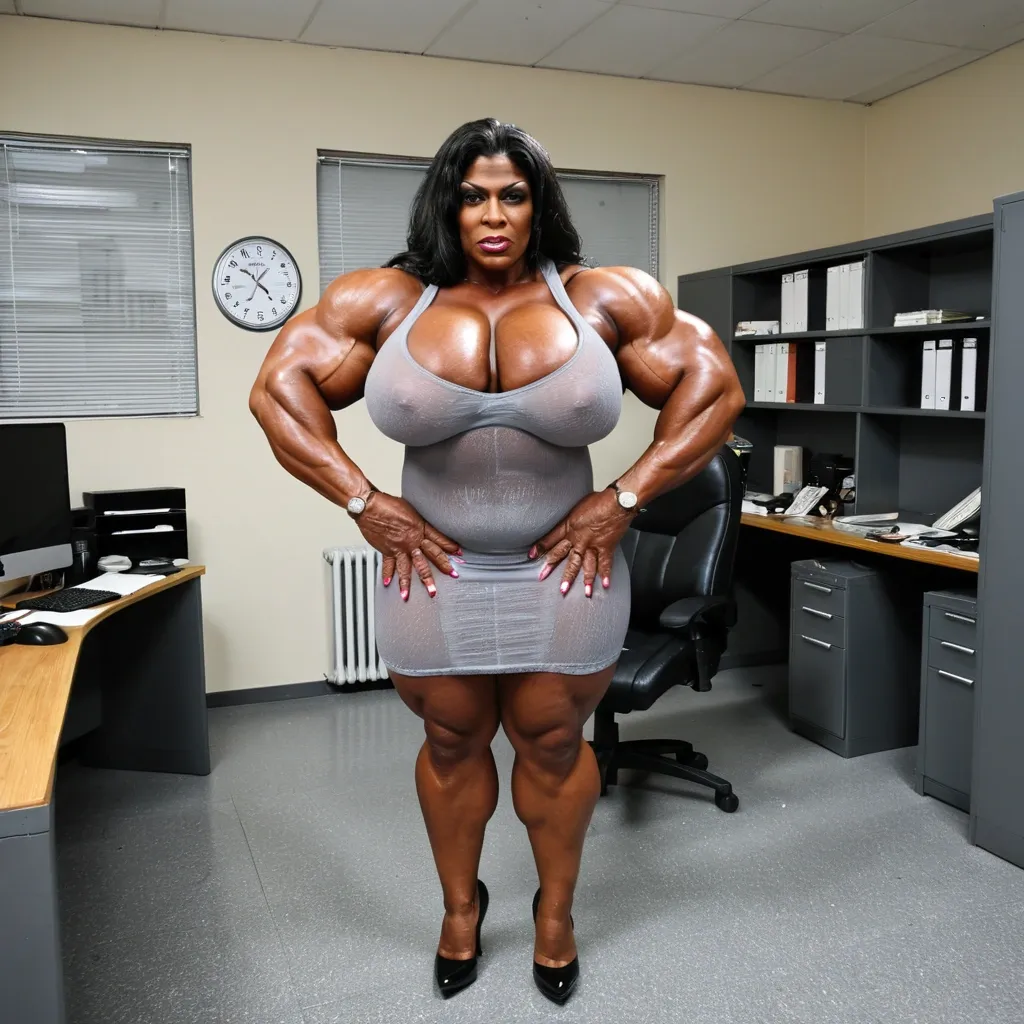 À giant muscular chubby most busty femalebodybuilder , housewife woman BBW musclée , heavy weight bodybuildeuse géante et plantureuse with giant chest , imposante dame massive , beautiful make up african beauty mature lady face , in a police station office , avec de gros seins , énormes biceps musclés , in black laces transparent very short mini loose nightgown with heels , exposant les seins , bras musclés exposés , dominante , jambes massives exposées , agressive , ,
