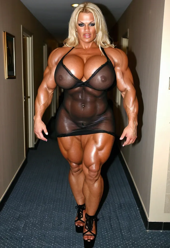 À giant muscular chubby most busty femalebodybuilder , housewife woman BBW musclée , heavy weight bodybuildeuse géante et plantureuse with giant chest , imposante dame massive , beautiful make up Pamela Anderson face , in a hôtel corridor , avec de gros seins , énormes biceps musclés , in black laces transparent very short mini loose nightgown with heels , exposant les seins , bras musclés exposés , dominante , jambes massives exposées , agressive , ,