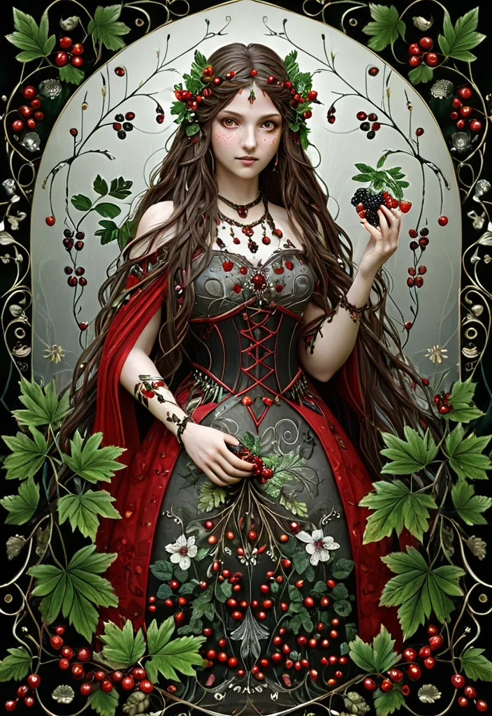 hyper-polished shading , glossy texture , fantasy character , eye glow , high contrast , ornate accessories , A beautiful gray-eyed chestnut-haired woman with long hair intertwined with grass and leaves , in a dress made of red and black currants , next to her stand two wolves , white and black , green leaves and strawberry shoots , grapes , grained volumetric floral patterned background , forest , berries and flowers of wild strawberries , blackberry , horsetail , fern , butterfly , embroidered leaves patterns , silk patterns , colored smalt , mother of pearl , ruby , gold dots , cracked glass , shiny and matte metal gold and silver , fog , thin lines , full color , noise-free rendering , crisp ultra-sharp focus ,