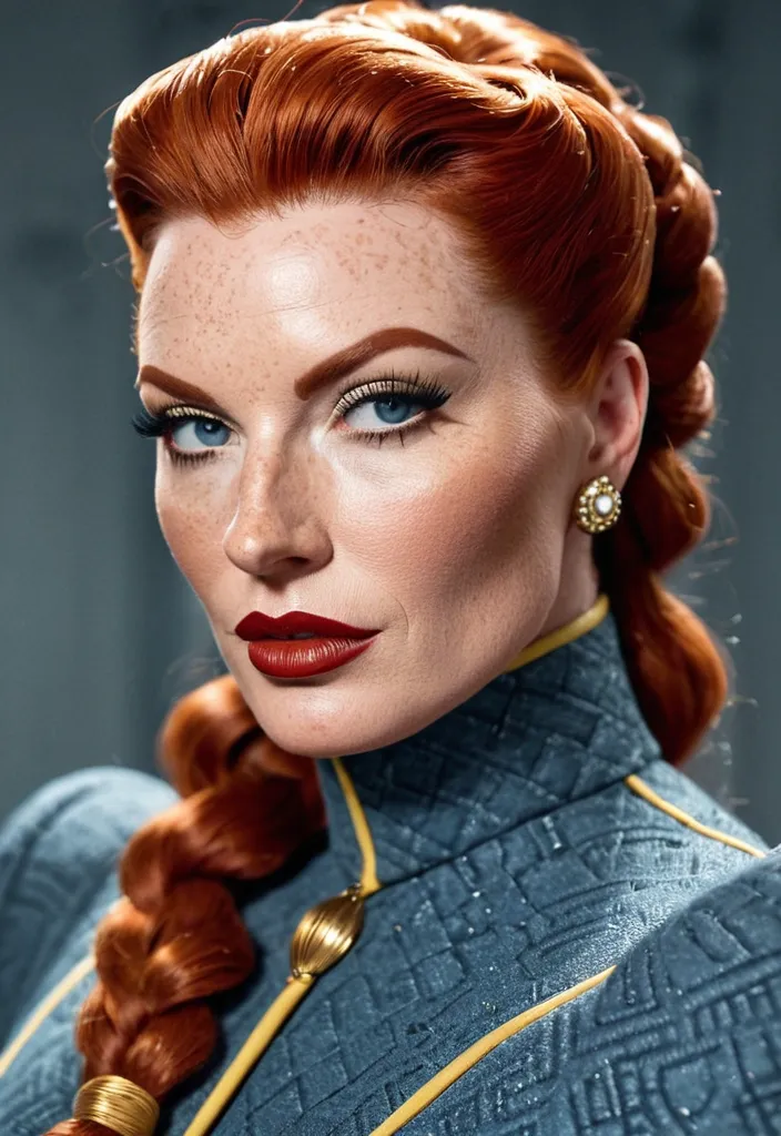 1940s era Generate Gorgeous female boss , bimbo , hourglass body , abnormally massive female bodybuilder , gorgeous , close up , full lips , big booty , redheaded , freckles on face and breast , 1940s hair , braided design hair , feminine silhouette , too big breast , big booty , sexy thighs abs , silhouette , up close , flexing biceps , beautiful green eyes , legs are iconic and defining physical feature , both visually and in terms of combat ability.wearing an outfit that is a striking blend of elegance , power , and femininity , designed to command attention in any room. The suit is tailored to perfection , hugging the wearer’s curves with precision while emphasizing a structured silhouette. The fabric itself is a refined grey tweed patterned with subtle white grid lines , giving the suit a texture that feels both sophisticated and modern. The blazer features broad blue lapels and gold button accents , adding a luxurious touch that elevates the look beyond typical business attire. The matching high-waisted trousers elongate the frame , further enhancing the poised and commanding effect of the ensemble.The styling choices amplify the boldness of the suit. The inner blouse is a silky , greybutton-down shirt that complements the tweed’s tone while introducing a softer , feminine balance to the sharp tailoring of the jacket. The blouse peeks out neatly from under the blazer , maintaining elegance without drawing focus away from the suit’s commanding cut. Accessories are kept minimal yet intentional: a delicate layered gold necklace and hoop earrings that add glimmers of light and luxury without overpowering the outfit. The choice of voluminous , honey-brown braids cascading down her shoulders frames the face with both confidence and glamour , completing the commanding visual.Altogether , this look communicates a blend of authority and allure. It is business-ready yet fashion-forward , balancing corporate structure with vibrant femininity. The color palette blue , grey and gold avoids being overly delicate , instead embracing the richness of texture , structure , and presence. This is the kind of ensemble that speaks to ambition , sophistication , and personal style—ideal for someone who thrives in positions of influence but insists on expressing her individuality with bold elegance. It’s not just clothing—it’s a statement of power wrapped in grace. ,