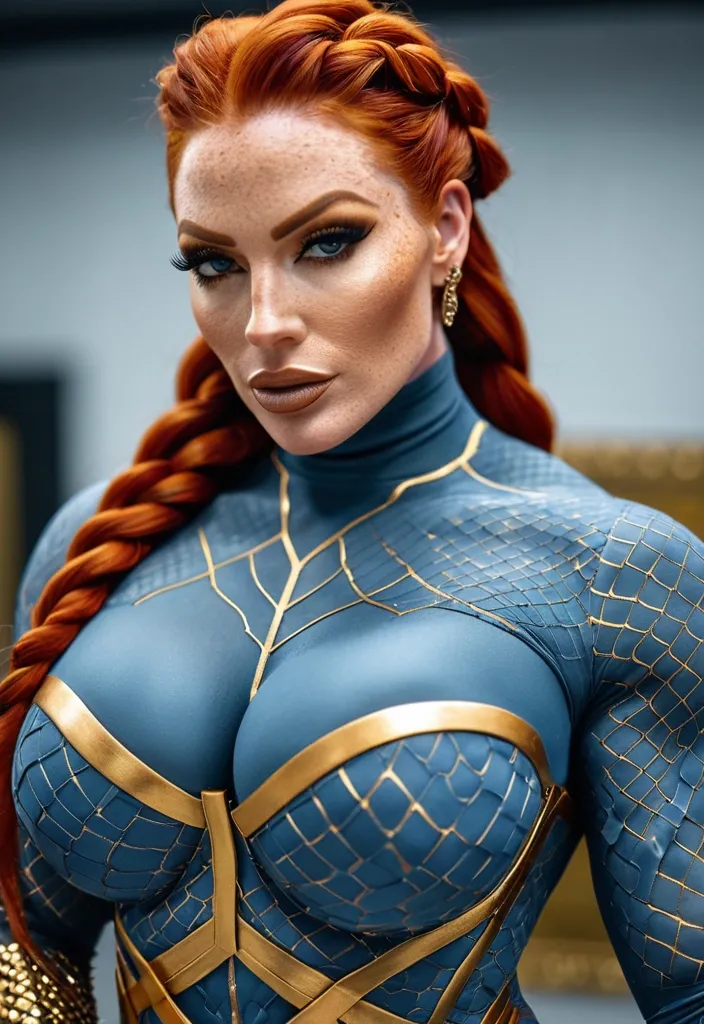 Generate Gorgeous female boss , bimbo , hourglass body , abnormally massive female bodybuilder , gorgeous , close up , full lips , big booty , redheaded , freckles on face and breast , braided design hair , feminine silhouette , too big breast , big booty , sexy thighs abs , silhouette , up close , flexing biceps , beautiful green eyes , legs are iconic and defining physical feature , both visually and in terms of combat ability.wearing an outfit that is a striking blend of elegance , power , and femininity , designed to command attention in any room. The suit is tailored to perfection , hugging the wearer’s curves with precision while emphasizing a structured silhouette. The fabric itself is a refined grey tweed patterned with subtle white grid lines , giving the suit a texture that feels both sophisticated and modern. The blazer features broad blue lapels and gold button accents , adding a luxurious touch that elevates the look beyond typical business attire. The matching high-waisted trousers elongate the frame , further enhancing the poised and commanding effect of the ensemble.The styling choices amplify the boldness of the suit. The inner blouse is a silky , greybutton-down shirt that complements the tweed’s tone while introducing a softer , feminine balance to the sharp tailoring of the jacket. The blouse peeks out neatly from under the blazer , maintaining elegance without drawing focus away from the suit’s commanding cut. Accessories are kept minimal yet intentional: a delicate layered gold necklace and hoop earrings that add glimmers of light and luxury without overpowering the outfit. The choice of voluminous , honey-brown braids cascading down her shoulders frames the face with both confidence and glamour , completing the commanding visual.Altogether , this look communicates a blend of authority and allure. It is business-ready yet fashion-forward , balancing corporate structure with vibrant femininity. The color palette blue , grey and gold avoids being overly delicate , instead embracing the richness of texture , structure , and presence. This is the kind of ensemble that speaks to ambition , sophistication , and personal style—ideal for someone who thrives in positions of influence but insists on expressing her individuality with bold elegance. It’s not just clothing—it’s a statement of power wrapped in grace. ,