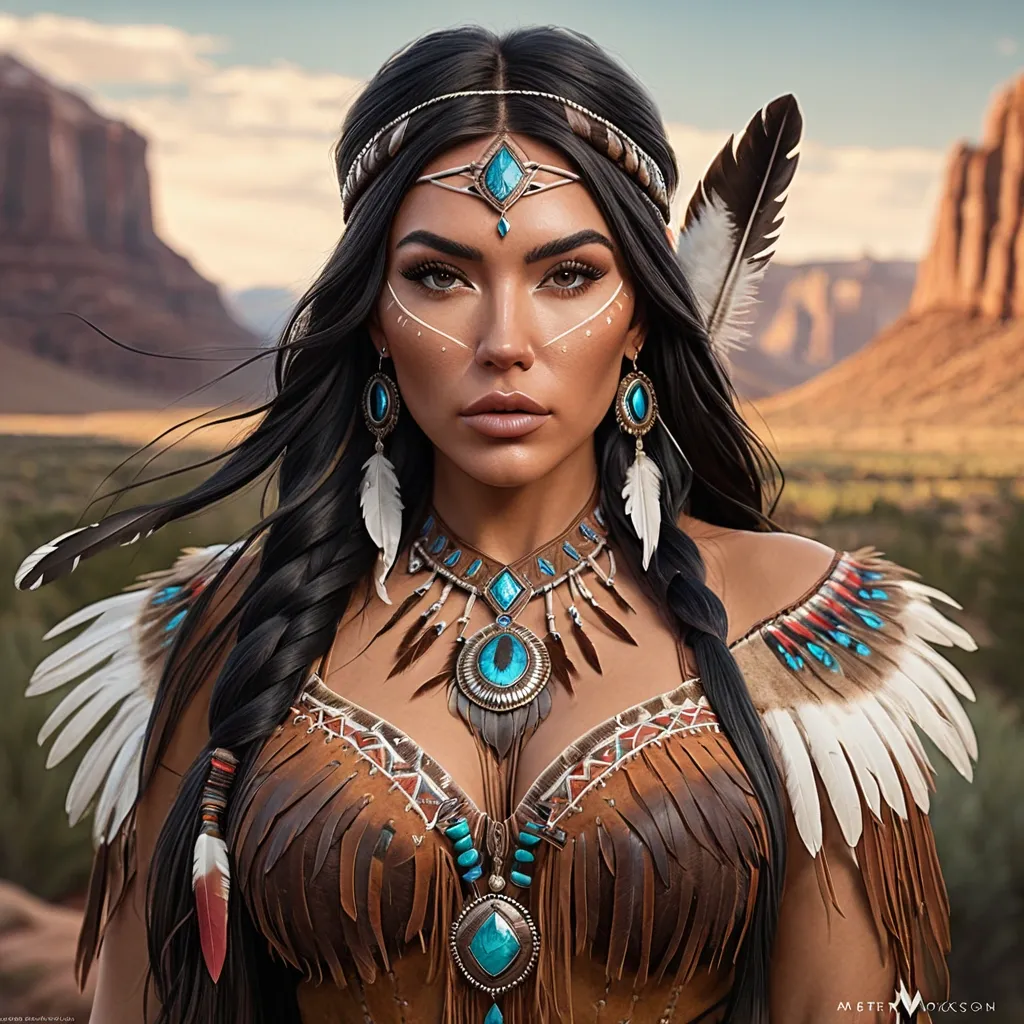 mdjrny-v4 style portrait photograph of Madison Beer as Pocahontas , young beautiful native american woman , perfect symmetrical face , feather jewelry , traditional handmade dress , armed female hunter warrior , (((wild west))) environment , Utah landscape , ultra realistic , concept art , elegant , ((intricate)) , ((highly detailed)) , depth of field , ((professionally color graded)) , 8k , art by artgerm and greg rutkowski and alphonse mucha ,