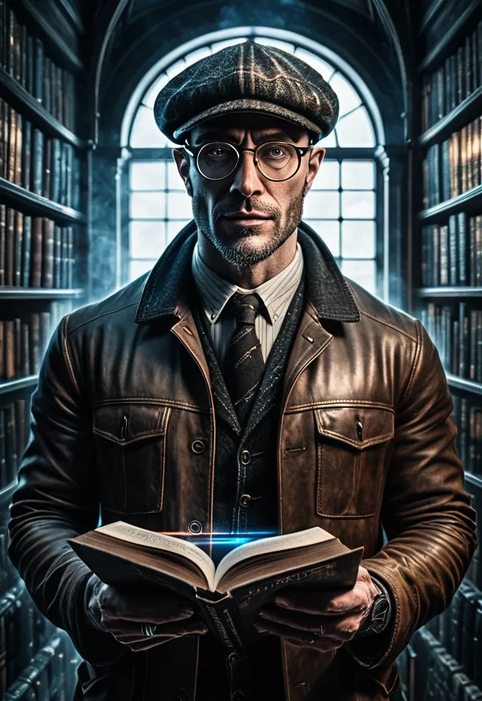 a full vertical portrait of a male college student with glasses , a flat cap , and a book of poetry , cinematic light , high dynamic range , insane intricate details , stunning cinema effects , aesthetic , character portrait , artwork in the style of Mandy Jurgens , Jon Foster , luis royo , 100mm lens , flat background ,