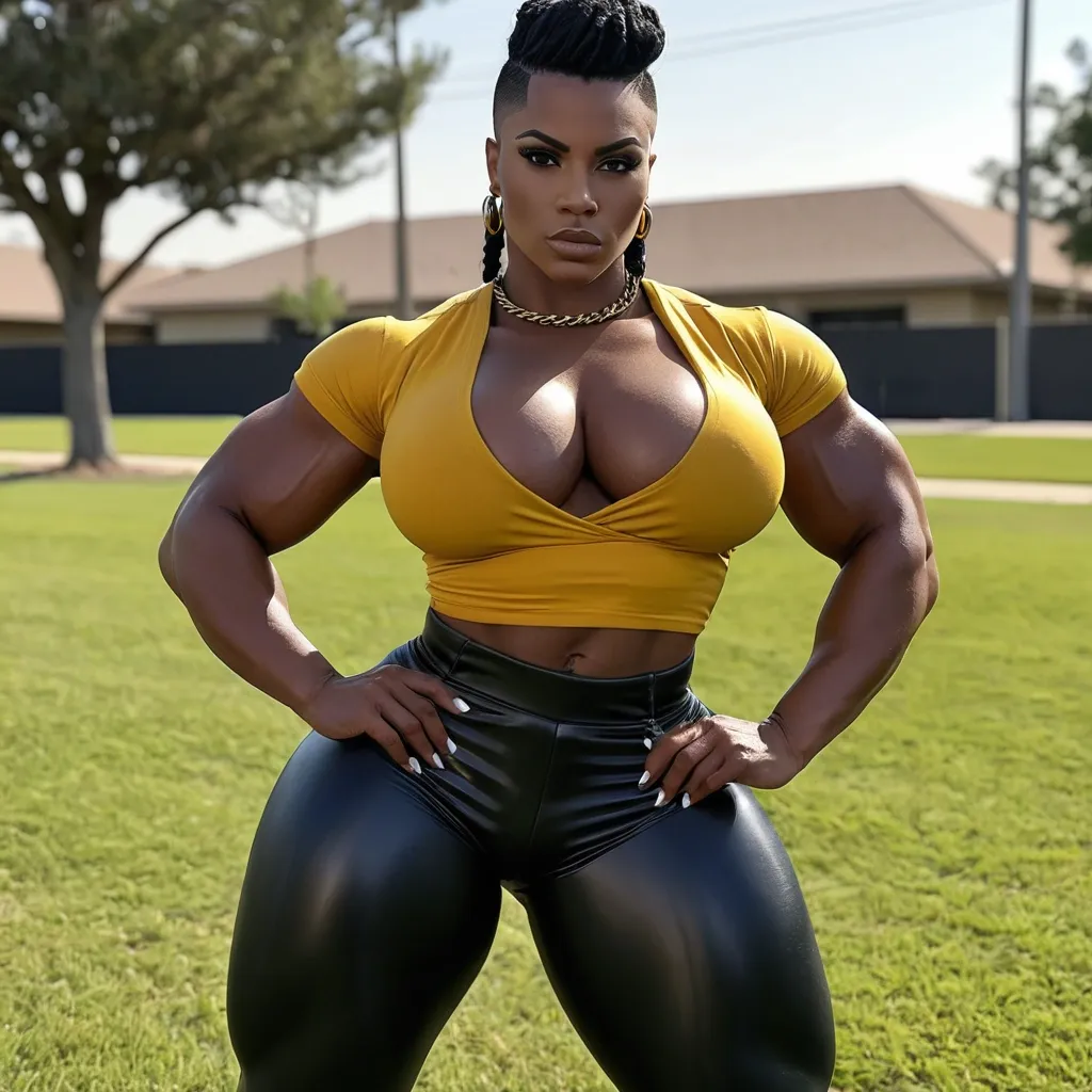 Generate a dark-skinned African-American woman , gorgeous female boss , bimbo , hourglass body , abnormally massive female bodybuilder , gorgeous , close up , full lips , big booty , black hair , braided-style-mohawk that she wears bald on the side , feminine silhouette , too big breast , big booty , sexy thighs abs , silhouette , up close , flexing biceps , beautiful light hazel eyes , legs are iconic and defining physical feature , both visually and in terms of combat ability.wearing an outfit that is a striking blend of elegance , power , and femininity , designed to command attention in any room. outfit in this image is a modern , giving it both structure and a touch of relaxed style. highlighting her curves while keeping the look balanced and versatile. Its neutral tone contrasts nicely against the blue denim , keeping the ensemble cohesive without overpowering the statement of the.Completing the polished and fashionable. Together , the outfit blends everyday comfort with bold , confident styling. This is the kind of ensemble that speaks to ambition , sophistication , and personal style—ideal for someone who thrives in positions of influence but insists on expressing her individuality with bold elegance. It’s not just clothing—it’s a statement of power wrapped in grace , Massive cleavage thunder thighs , enormous butt , muscular legs , hazel eyes , up close shot. Black and yellow t-shirt and black pants outside in recreational field , closed top collar , pants ,