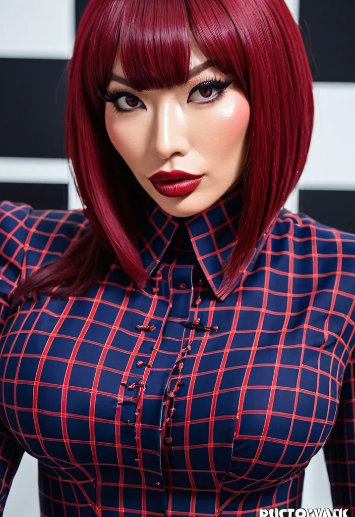 Generate Gorgeous female boss , Japanese woman , pointy face , bimbo , hourglass body , abnormally massive female bodybuilder , gorgeous , close up , full lips , big booty , red hair breast , bob-cut , bangs cover forhead design hair , feminine silhouette , too big breast , big booty , sexy thighs abs , silhouette , up close , flexing biceps , beautiful green eyes , legs are iconic and defining physical feature , both visually and in terms of combat ability.wearing an outfit that is a striking blend of elegance , power , and femininity , designed to command attention in any room. The suit is tailored to perfection , hugging the wearer’s curves with precision while emphasizing a structured silhouette. The fabric itself is a refined grey tweed patterned with subtle white grid lines , giving the suit a texture that feels both sophisticated and modern. The blazer features broad blue lapels and gold button accents , adding a luxurious touch that elevates the look beyond typical business attire. The matching high-waisted trousers elongate the frame , further enhancing the poised and commanding effect of the ensemble.The styling choices amplify the boldness of the suit. The inner blouse is a silky , greybutton-down shirt that complements the tweed’s tone while introducing a softer , feminine balance to the sharp tailoring of the jacket. The blouse peeks out neatly from under the blazer , maintaining elegance without drawing focus away from the suit’s commanding cut. Accessories are kept minimal yet intentional: a delicate layered gold necklace and hoop earrings that add glimmers of light and luxury without overpowering the outfit. The choice oframes the face with both confidence and glamour , completing the commanding visual.Altogether , this look communicates a blend of authority and allure. It is business-ready yet fashion-forward , balancing corporate structure with vibrant femininity. The color palette blue , grey and gold avoids being overly delicate , instead embracing the richness of texture , structure , and presence. This is the kind of ensemble that speaks to ambition , sophistication , and personal style—ideal for someone who thrives in positions of influence but insists on expressing her individuality with bold elegance. It’s not just clothing—it’s a statement of power wrapped in grace. In luxury living legs that could crush a watermelon , skirt high boots are a bold and striking statement piece , crafted in glossy black patent leather that gives them a sleek , polished finish. Rising to just below the knee , the boots feature three adjustable buckle straps along the shaft , adding both edge and detail to their design. The towering stiletto heel , paired with a thick platform sole , creates an ultra-dramatic silhouette that elongates the leg and exudes power and confidence. With their combination of shine , height , and structure , these boots perfectly balance fierce femininity with high-fashion allure. Gorgeous brown eyes , nose ring , big lips glossy lips , enormous breast , enormous butt , checkered pattern burgundy , navy blue and black accented oxford dress shirt , ,