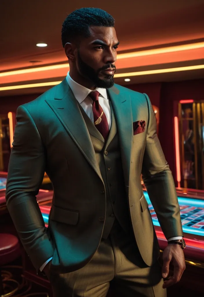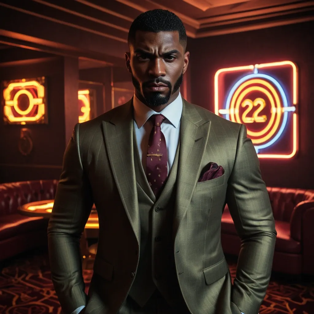 He is a Alpha Male , bodybuilder build , African-American man , He stands like a storm given a suit—tall , carved from power , and refined with purpose. His coarse , perfectly tapered hair crowns a face built from sharp geometry: high , sculpted cheekbones , a strong brow , and a jawline cut with the precision of a master craftsman. His gorgeous dark-brown eyes carry that quiet fire—focused , unblinking , the kind of gaze that tells a man’s whole story without offering a single hint. Full lips rest in a controlled , unreadable line , and the beard that frames them is immaculate , tight , and regal.His body looks engineered , not grown—broad , boulder shoulders pushing against the fabric of his tailored suit , arms thick and defined with every ridge of muscle visible even through the gold-toned weave. His chest and torso form a powerful taper into a narrow waist , emphasized by the deep olive vest and the sharp knot of his burgundy tie. Every stitch on him is intentional: the crisp lapels , the metallic trim tracing the angles of his physique , the pocket square folded with the kind of discipline that suggests he’s as dangerous as he is elegant.Behind him , Dream City glows in neon blues , reds , and molten gold—a retro-futuristic casino lounge where the dice never stop rolling and the air hums with electricity. The “21” neon cube burns above him like a crown of chance and danger , casting cinematic highlights across his suit and skin. He stands there in the middle of it all—debonair , imposing , and unbothered—looking like the man who owns the room , the night , and every secret hiding in its shadows. ,