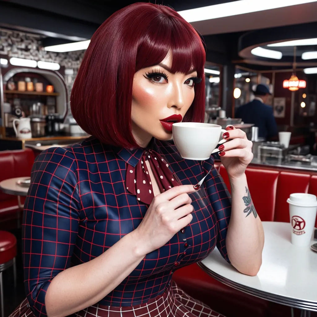 Generate Gorgeous female boss , Japanese woman , pointy face , bimbo , hourglass body , abnormally massive female bodybuilder , gorgeous , close up , full lips , big booty , red hair breast , bob-cut , bangs cover forhead design hair , feminine silhouette , too big breast , big booty , sexy thighs abs , silhouette , up close , flexing biceps , beautiful green eyes , legs are iconic and defining physical feature , both visually and in terms of combat ability.wearing an outfit that is a striking blend of elegance , power , and femininity , designed to command attention in any room. The suit is tailored to perfection , hugging the wearer’s curves with precision while emphasizing a structured silhouette. The fabric itself is a refined grey tweed patterned with subtle white grid lines , giving the suit a texture that feels both sophisticated and modern. The blazer features broad blue lapels and gold button accents , adding a luxurious touch that elevates the look beyond typical business attire. The matching high-waisted trousers elongate the frame , further enhancing the poised and commanding effect of the ensemble.The styling choices amplify the boldness of the suit. The inner blouse is a silky , greybutton-down shirt that complements the tweed’s tone while introducing a softer , feminine balance to the sharp tailoring of the jacket. The blouse peeks out neatly from under the blazer , maintaining elegance without drawing focus away from the suit’s commanding cut. Accessories are kept minimal yet intentional: a delicate layered gold necklace and hoop earrings that add glimmers of light and luxury without overpowering the outfit. The choice oframes the face with both confidence and glamour , completing the commanding visual.Altogether , this look communicates a blend of authority and allure. It is business-ready yet fashion-forward , balancing corporate structure with vibrant femininity. The color palette blue , grey and gold avoids being overly delicate , instead embracing the richness of texture , structure , and presence. This is the kind of ensemble that speaks to ambition , sophistication , and personal style—ideal for someone who thrives in positions of influence but insists on expressing her individuality with bold elegance. It’s not just clothing—it’s a statement of power wrapped in grace. In luxury living legs that could crush a watermelon , skirt high boots are a bold and striking statement piece , crafted in glossy black patent leather that gives them a sleek , polished finish. Rising to just below the knee , the boots feature three adjustable buckle straps along the shaft , adding both edge and detail to their design. The towering stiletto heel , paired with a thick platform sole , creates an ultra-dramatic silhouette that elongates the leg and exudes power and confidence. With their combination of shine , height , and structure , these boots perfectly balance fierce femininity with high-fashion allure. Gorgeous brown eyes , nose ring , big lips glossy lips , enormous breast , enormous butt , checkered pattern burgundy , navy blue and black accented oxford dress shirt , and matching skirt drinking coffee , in a 1940s/futuristic coffee shop ,