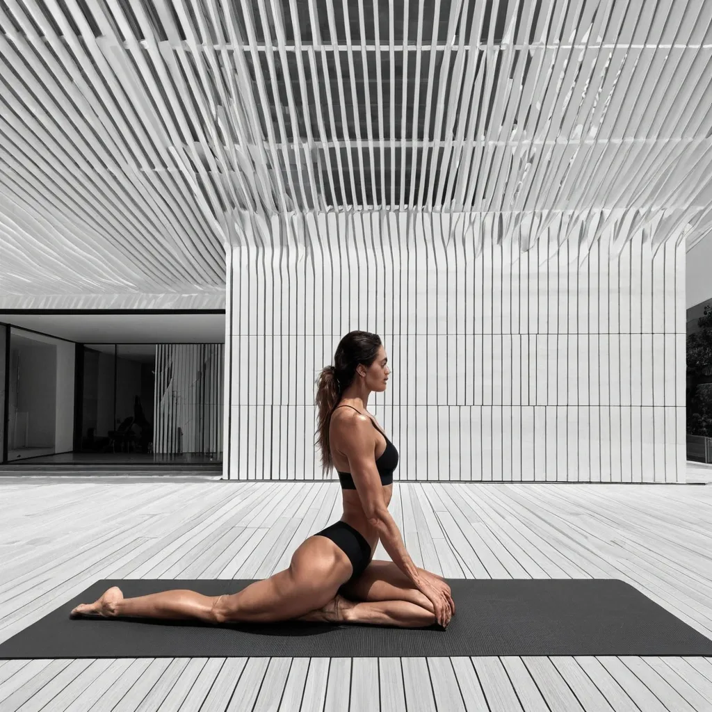 Minimalist line illustration , a woman unrolling a yoga mat in a yoga studio , simple continuous line drawing , monochrome , hand-drawn sketch style , minimal details , calm aesthetic , modern editorial illustration , not cartoon , not anime , clean composition , light and airy , Scandinavian minimalism. Yoga studio interior with red brick walls , high ceilings and large rectangular windows. On the windowsill there are potted plants , more plants on the floor in the corner , and hanging ferns near the top of the window frame. Through the windows you can see a quiet urban street similar to Oktyabrskaya street in Minsk. Soft warm beige background , dark brown line art , same colors , same line weight , minimal lines , calm yoga atmosphere. background kept very simple , minimal architectural lines , focus on the woman and the yoga mat ,
