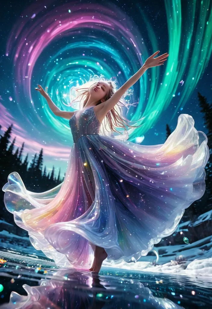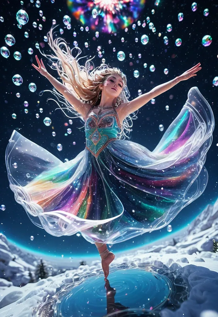 Aerial perspective , top-down view of dancer in dynamic motion , rendered entirely as a vortex Moroccan traditional dress , floating hair , cosmic eye , pale skin , looking up , cute pose. BREAK. crystal clear bubbles (shining prism , in the sky) , beautiful universe , (photo-realistic huge beautiful colorful aurora:1.2) , high color saturation , ground (made of water , reflecting aurora) , many colorful (realistic crystal snowflakes:1.2) blooming everywhere , (shiny wind flow) , stars sparkle , from below , dynamic angle , BREAK. quality , masterpiece , high score , great score , very aesthetic , high resolution , ultra-detailed , absurdness , newest , scenery , depth of field , fairy-tale , dreamlike. ,