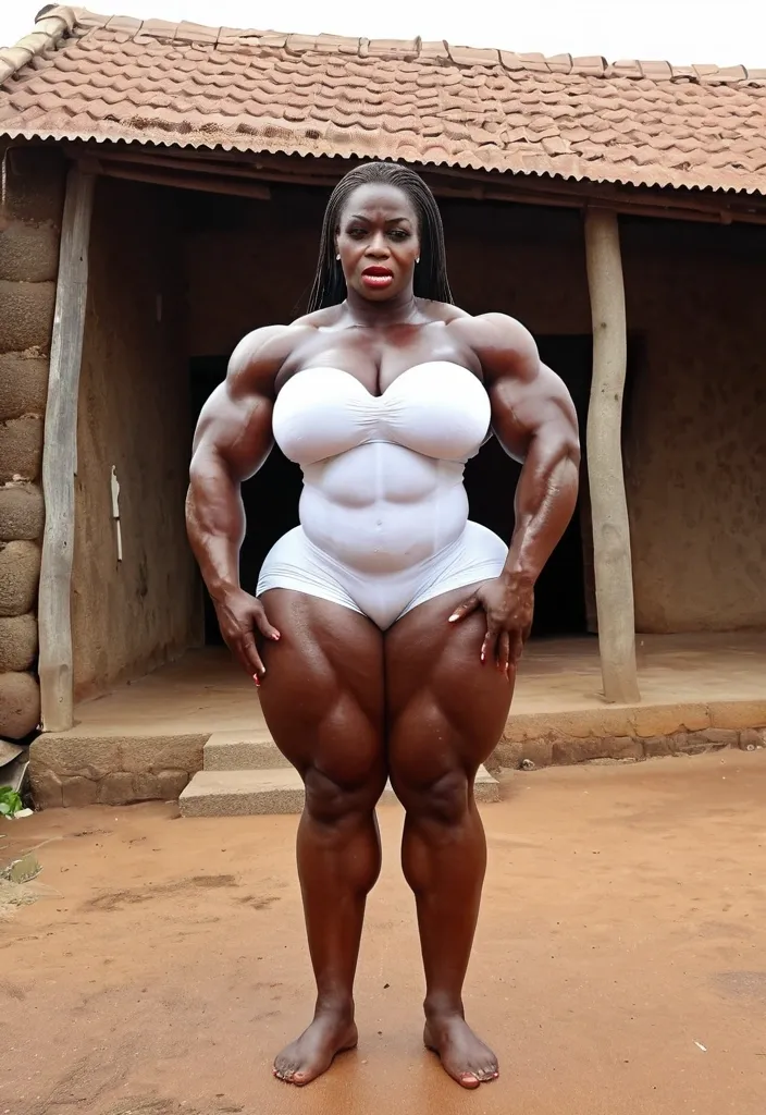 Very big Gorgeous village woman too bbw muscular enormous african bimbo powerlifteuse , abnormally massive female muscular bodybuilder , bbw , Géante dame , beautiful face , curvacious , gorgeous , wearing sexiest short mini skirt and laces bra qui expose ses gros biceps et ses seins debordants , flexing muscles , cuisses en évidence , flexing biceps , make up , pov boxing pose , sensual teasing ,