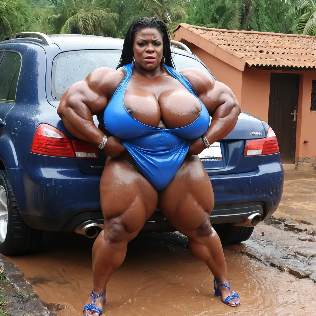 Plan de profil de Very curvy ssbbw beauty bimbo and muscular too busty mother with too big implants breast , very enormous ass , bbw muscular enormous bimbo powerlifteuse , abnormally massive female muscular bodybuilder , bbw , Géante dame , very big ass , curvacious , gorgeous , very beautiful loretta devine face , flexing bare-fist with soaked clothes in african village , wearing a blue skit wet long sleeveless mini dress , gros seins en évidence , gros biceps énormes , flexing muscles , cuisses en évidence , portant des talons , make up , very big ass , vue de profil ,