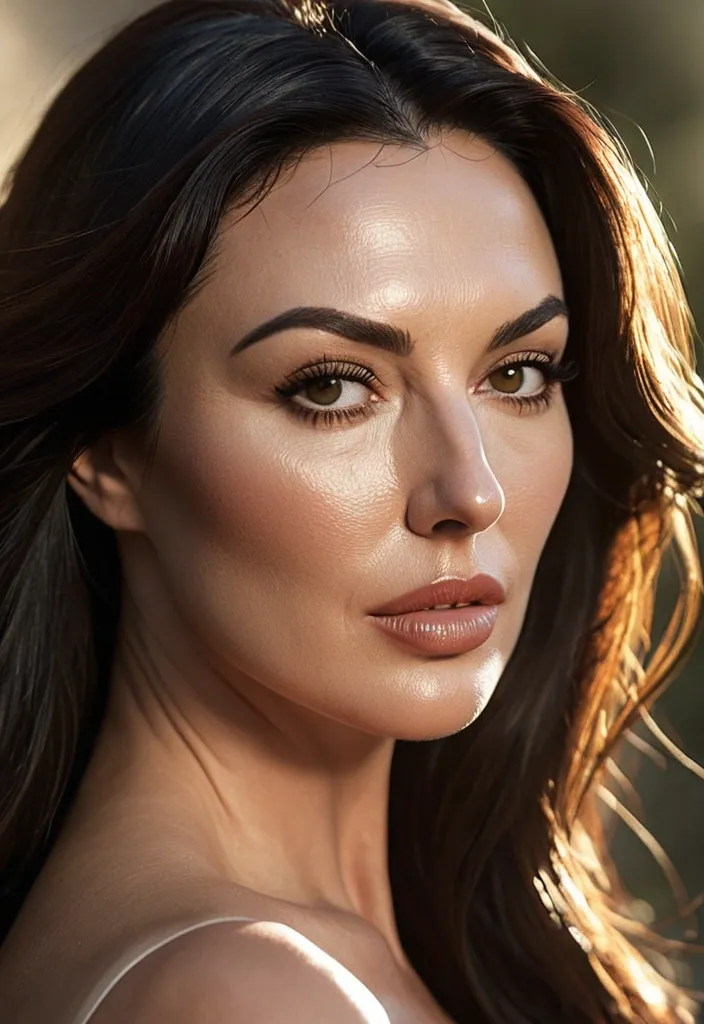 Create a photorealistic portrait of Monica Bellucci at her prime , capturing her youthful and elegant beauty with flawless glowing skin under warm natural sunlight. The image should emphasize soft shadows and delicate highlights to showcase realistic texture and depth of her face. Her expression should be sensual yet graceful , with detailed eyes , soft hair , and smooth skin texture. Use a subtle blurred natural background and cinematic lighting to make the portrait appear as a high-resolution , lifelike photograph. ,