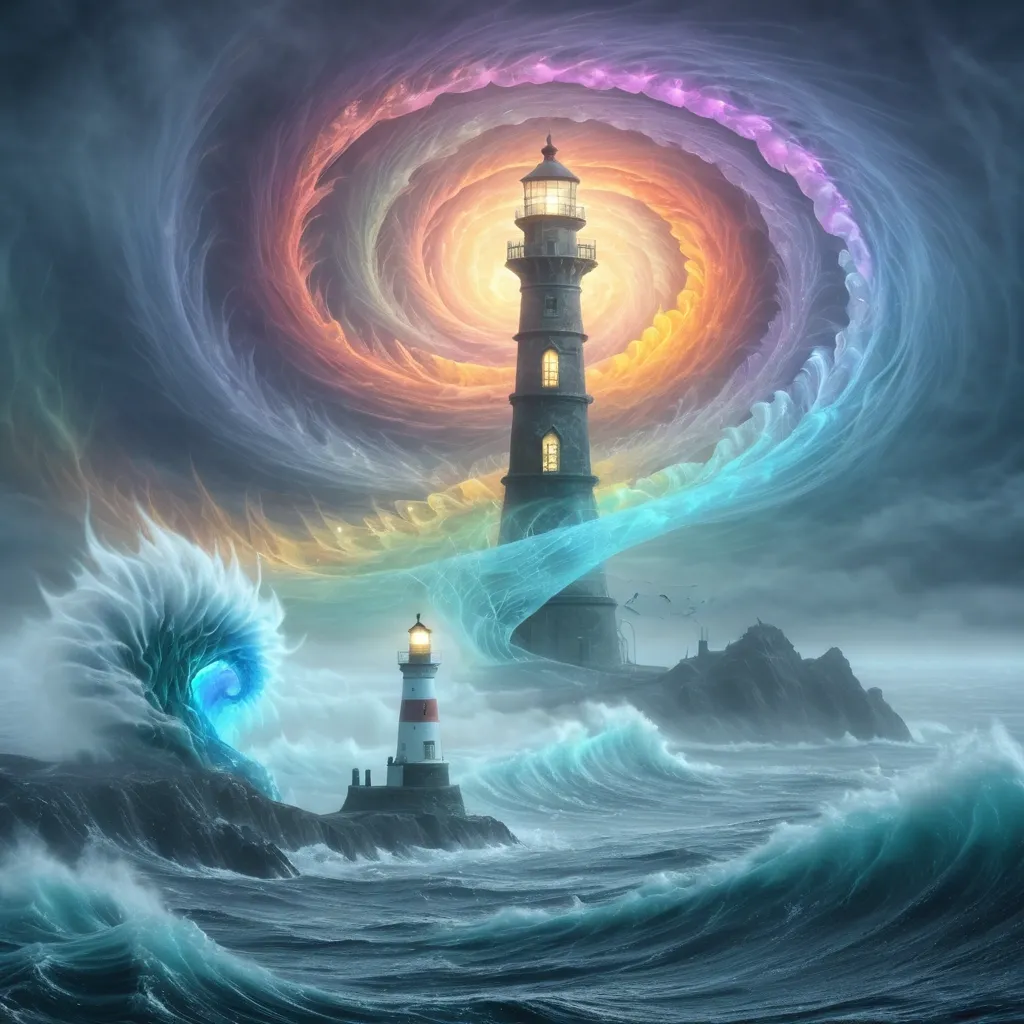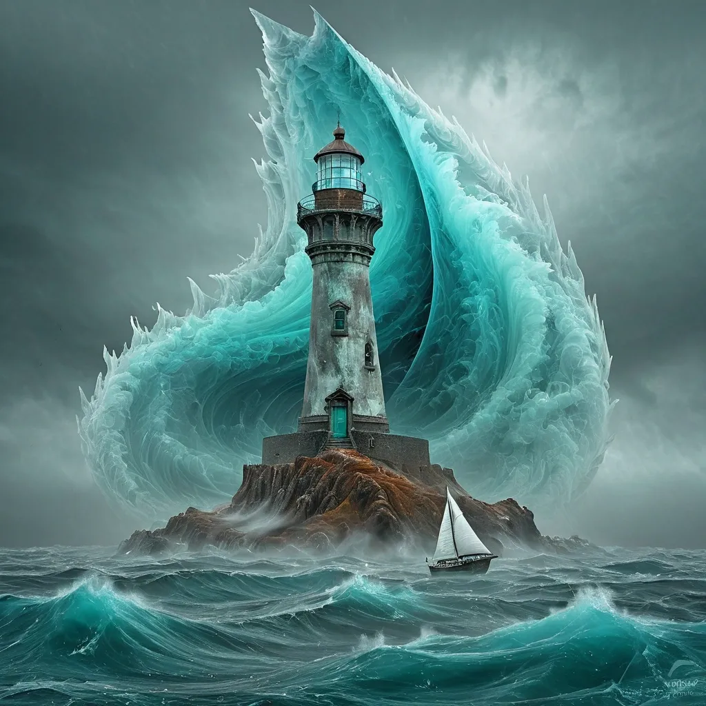 Lonely lighthouse in endless fog and heavy seas , colorful fractal plasma energy vortex. a pulling Prism Assemblage Encapsulated within shaped of sailboat with torn sails shrouded in mist navigating in the middle of stormy turquoise ocean. The most striking element is the sky . Thick , billowing clouds stretch across the sky , heavy and textured with tones of grey , brown , and hints of blue. ,