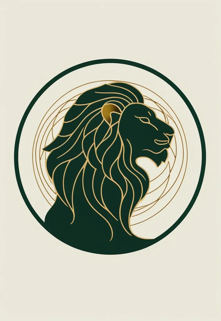 Masterpiece: Minimalist logo emblem. A single continuous line forms a lion's profile that seamlessly becomes the arm of a scales , which then curves into a root system. Contained within a perfect circle. Flat design , two colors: deep green and warm gold. Clean , professional , sacred geometry. Highquality ,