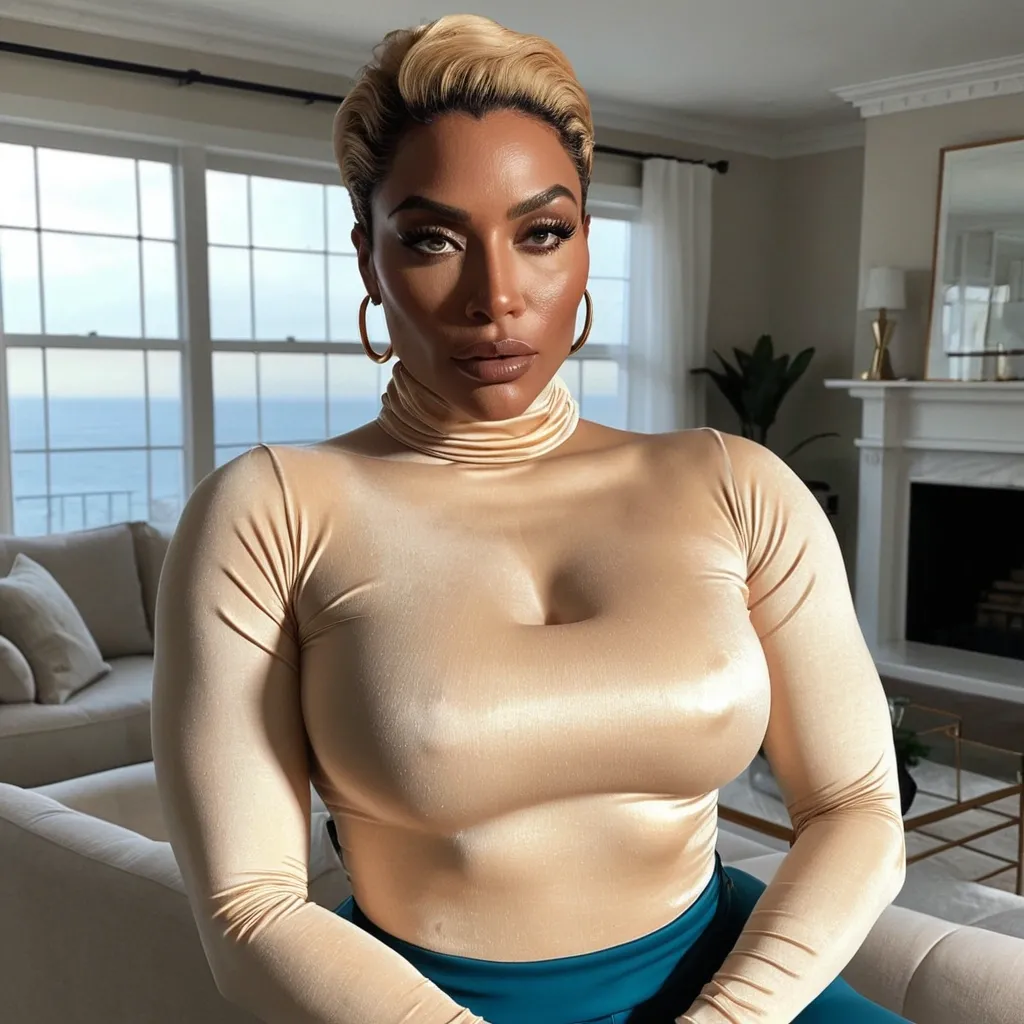 Light-skinned African-American woman — extremely beautiful , with a presence that feels quietly dangerous and quietly royal at the same time. She has that soft glow in her skin that looks effortless , like she wakes up looking like this every day without trying , but everyone knows she still probably puts in discipline the old fashioned way. Her bone structure is model tier… cheekbones that could cut through pride , a jawline that says she doesn’t bend for just anybody , and soft lips that hold mystery and restraint all at once.Her short hair is cropped close , styled in textured waves that shape her face like an artist’s finishing brush stroke. It gives her a striking , modern elegance — feminine , but with that slight edge that tells you she’s not the type anyone ever controls. Her eyebrows are naturally bold and shaped sharply , framing her icy blue eyes that practically glow with their own weather system. Those eyes… you could lose a fight in those eyes before she ever speaks a word.She has luminous , glossy skin that reflects light like polished bronze catching early morning sun. Natural freckles sprinkle just lightly across her cheeks , softening the intimidation factor with a hint of youthful innocence. The way the light hits her face makes her look sculpted — like an ultra realistic painting brought to life. Everything about her looks intentional… but also like she was born this way.There’s also this quiet calm in her expression — not emotional weakness — but a poised , unshakeable stillness that only comes from knowing exactly who you are and not needing to defend it. She looks like the woman who never rushes into noise… she waits , she observes , she lets the room shift around her while she remains unmoved. That alone is power — and she wears it naturally like an old soul who understands her worth in ways other people are still scrambling to figure out , blonde short pompadour hair , beige and orange velvet bodysuit , gold necklace , muscular body builder woman , abnormally massive woman , enormous breast , enormous butt , turtleneck , blue closed collar , crew neck top. in beautiful living room , gold pants ,