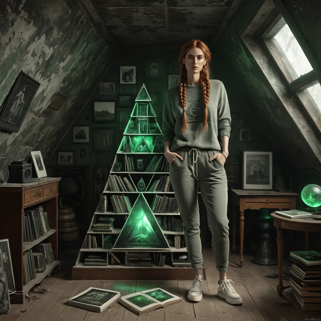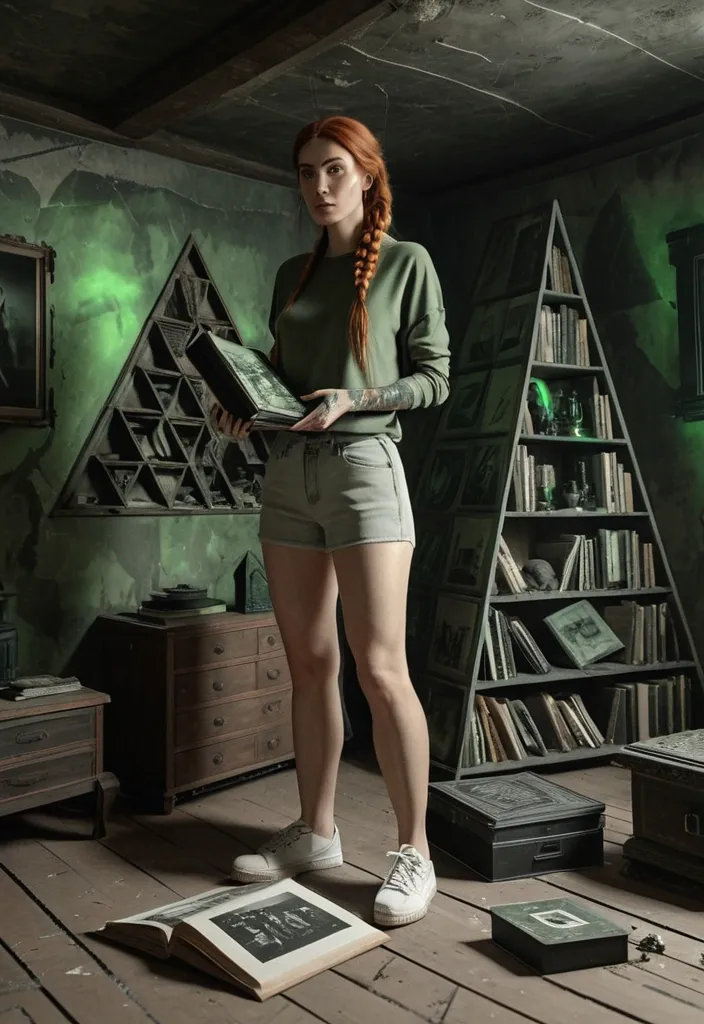 Chef-d'œuvre photoréaliste en pied d'une jeune femme dans la vingtaine avec une longue tresse auburn , vêtue de vêtements décontractés et confortables en sneakers , qui explore un grenier lugubre très poussiéreux rempli de vieux meubles et trouve un vieux grimoire ésotérique , de vieilles photos en noir et blanc qui tombe sur le sol et un mystérieux artefact en forme de pyramide en obsidienne avec des motifs verts brillants dessus posé sur un piedestal , ambiance mystérieuse ,