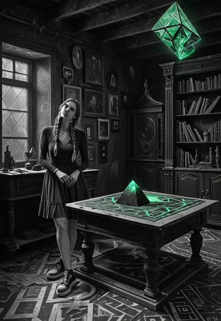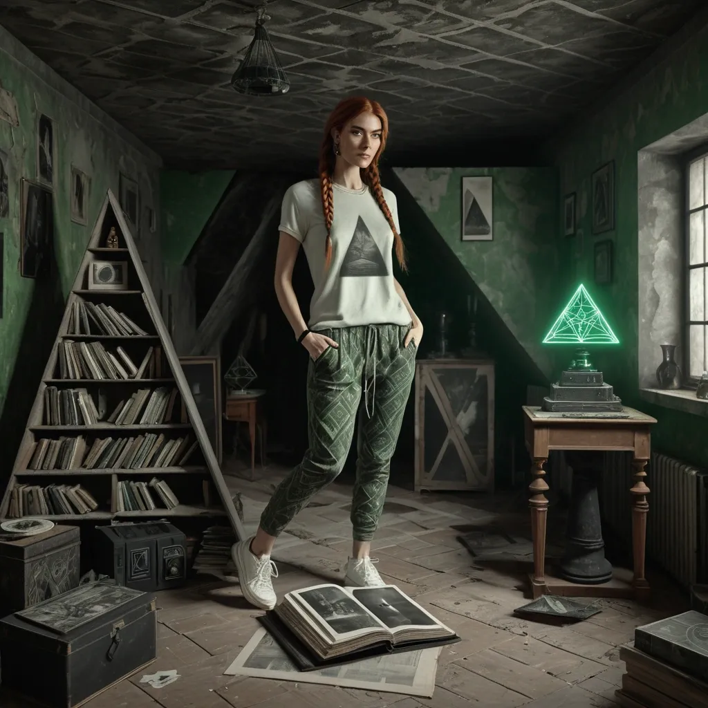Chef-d'œuvre photoréaliste en pied d'une jeune femme dans la vingtaine longue tresse auburn en vêtements décontractés et confortables elle se tient debout et porte des sneakers confortables , explore un grenier très poussiéreux et trouve un vieil album photo avec de vieilles photos en noir et blanc et un mysterieux artefact de forme pyramidale en obsidienne avec des motifs verts brillant dessus , posé sur un piedestal. Ambiance mystérieuse ,