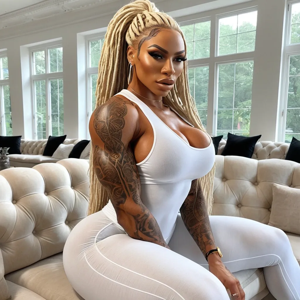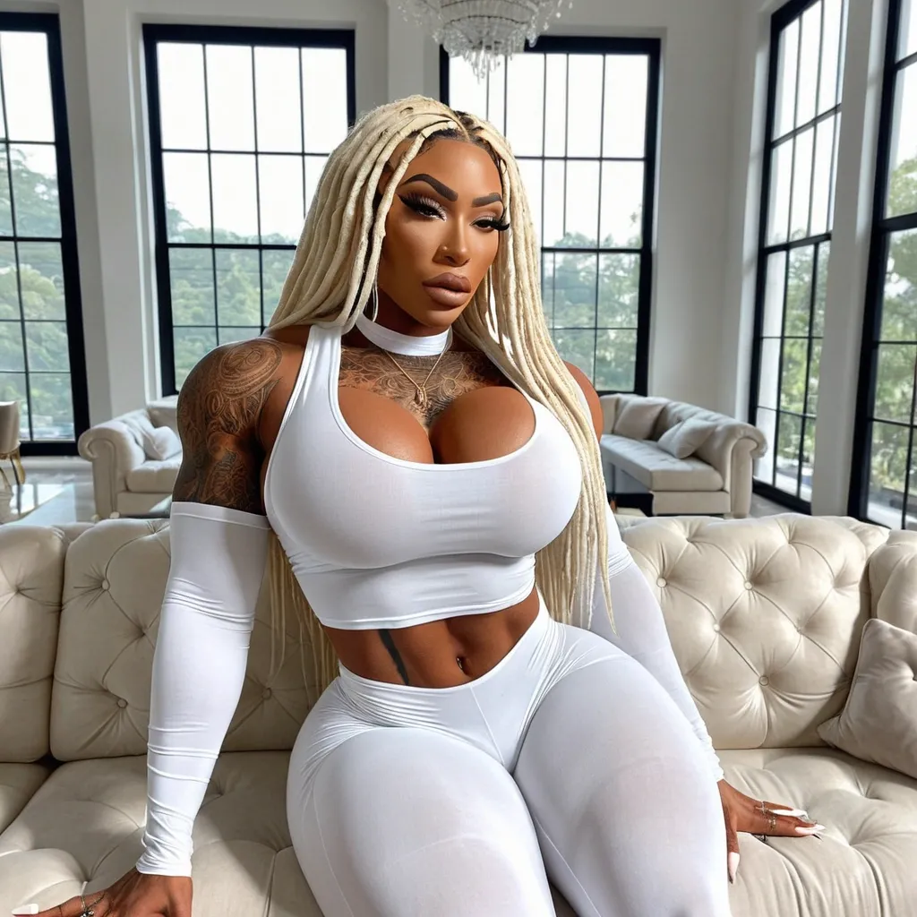 Generate Gorgeous female boss , light-skinned African-American man , bimbo , hourglass body , abnormally massive female bodybuilder , gorgeous , close up , full lips , big booty , blonde , freckles on face and breast , dreadlocks design hair , feminine silhouette , too big breast , big booty , sexy thighs abs , silhouette , up close , flexing biceps , beautiful hazel-green eyes , legs are iconic and defining physical feature , both visually and in terms of combat ability.wearing an outfit that is a striking blend of elegance , power , and femininity , designed to command attention in any room. The suit is tailored to perfection , hugging the wearer’s curves with precision while emphasizing a structured silhouette. The fabric itself is a refined grey tweed patterned with subtle white grid lines , giving the suit a texture that feels both sophisticated and modern. The blazer features broad blue lapels and gold button accents , adding a luxurious touch that elevates the look beyond typical business attire. The matching high-waisted trousers elongate the frame , further enhancing the poised and commanding effect of the ensemble.The styling choices amplify the boldness of the suit. The inner blouse is a silky , greybutton-down shirt that complements the tweed’s tone while introducing a softer , feminine balance to the sharp tailoring of the jacket. The blouse peeks out neatly from under the blazer , maintaining elegance without drawing focus away from the suit’s commanding cut. Accessories are kept minimal yet intentional: a delicate layered gold necklace and hoop earrings that add glimmers of light and luxury without overpowering the outfit. The choice of voluminous , honey-brown braids cascading down her shoulders frames the face with both confidence and glamour , completing the commanding visual.Altogether , this look communicates a blend of authority and allure. It is business-ready yet fashion-forward , balancing corporate structure with vibrant femininity. The color palette blue , grey and gold avoids being overly delicate , instead embracing the richness of texture , structure , and presence. This is the kind of ensemble that speaks to ambition , sophistication , and personal style—ideal for someone who thrives in positions of influence but insists on expressing her individuality with bold elegance. It’s not just clothing—it’s a statement of power wrapped in grace. In luxury living legs that could crush a watermelon , skirt high boots are a bold and striking statement piece , crafted in glossy black patent leather that gives them a sleek , polished finish. Rising to just below the knee , the boots feature three adjustable buckle straps along the shaft , adding both edge and detail to their design. The towering stiletto heel , paired with a thick platform sole , creates an ultra-dramatic silhouette that elongates the leg and exudes power and confidence. With their combination of shine , height , and structure , these boots perfectly balance fierce femininity with high-fashion allure. Wearing a long too , big long white pajama tank top , in Mansion with tall windows , enormous butt , enormous breast , sitting on couch , stacked , ,