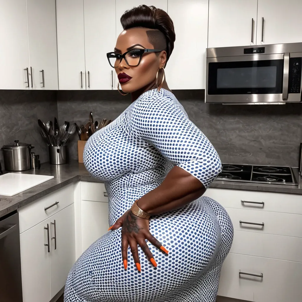 Generate Gorgeous female boss , bimbo , eye glasses , very dark-skinned African-American woman , very big lips , hourglass body , abnormally massive female bodybuilder , gorgeous , close up , full lips , big booty , brown hair , short pixie hair , feminine silhouette , too big breast , big booty , sexy thighs abs , silhouette , up close , flexing biceps , beautiful brown eyes , legs are iconic and defining physical feature , both visually and in terms of combat ability.wearing an outfit that is a striking blend of elegance , power , and femininity , designed to command attention in any room. The suit is tailored to perfection , hugging the wearer’s curves with precision while emphasizing a structured silhouette. The fabric itself is a refined grey tweed patterned with subtle white grid lines , giving the suit a texture that feels both sophisticated and modern. The blazer features broad blue lapels and gold button accents , adding a luxurious touch that elevates the look beyond typical business attire. The matching high-waisted trousers elongate the frame , further enhancing the poised and commanding effect of the ensemble.The styling choices amplify the boldness of the suit. The inner blouse is a silky , greybutton-down shirt that complements the tweed’s tone while introducing a softer , feminine balance to the sharp tailoring of the jacket. The blouse peeks out neatly from under the blazer , maintaining elegance without drawing focus away from the suit’s commanding cut. Accessories are kept minimal yet intentional: a delicate layered gold necklace and hoop earrings that add glimmers of light and luxury without overpowering the outfit. The choice of voluminous , honey-brown braids cascading down her shoulders frames the face with both confidence and glamour , completing the commanding visual.Altogether , this look communicates a blend of authority and allure. It is business-ready yet fashion-forward , balancing corporate structure with vibrant femininity. The color palette blue , grey and gold avoids being overly delicate , instead embracing the richness of texture , structure , and presence. This is the kind of ensemble that speaks to ambition , sophistication , and personal style—ideal for someone who thrives in positions of influence but insists on expressing her individuality with bold elegance. It’s not just clothing—it’s a statement of power wrapped in grace. In luxury living legs that could crush a watermelon , skirt high boots are a bold and striking statement piece , crafted in glossy black patent leather that gives them a sleek , polished finish. Rising to just below the knee , the boots feature three adjustable buckle straps along the shaft , adding both edge and detail to their design. The towering stiletto heel , paired with a thick platform sole , creates an ultra-dramatic silhouette that elongates the leg and exudes power and confidence. With their combination of shine , height , and structure , these boots perfectly balance fierce femininity with high-fashion allure. High cheekbones , prominent jawline , gorgeous big brown eyes , , enormous breast , white and blue pin-dot patterned dress , enormous butt , powerful hips , in the the kitchen , long dress ,