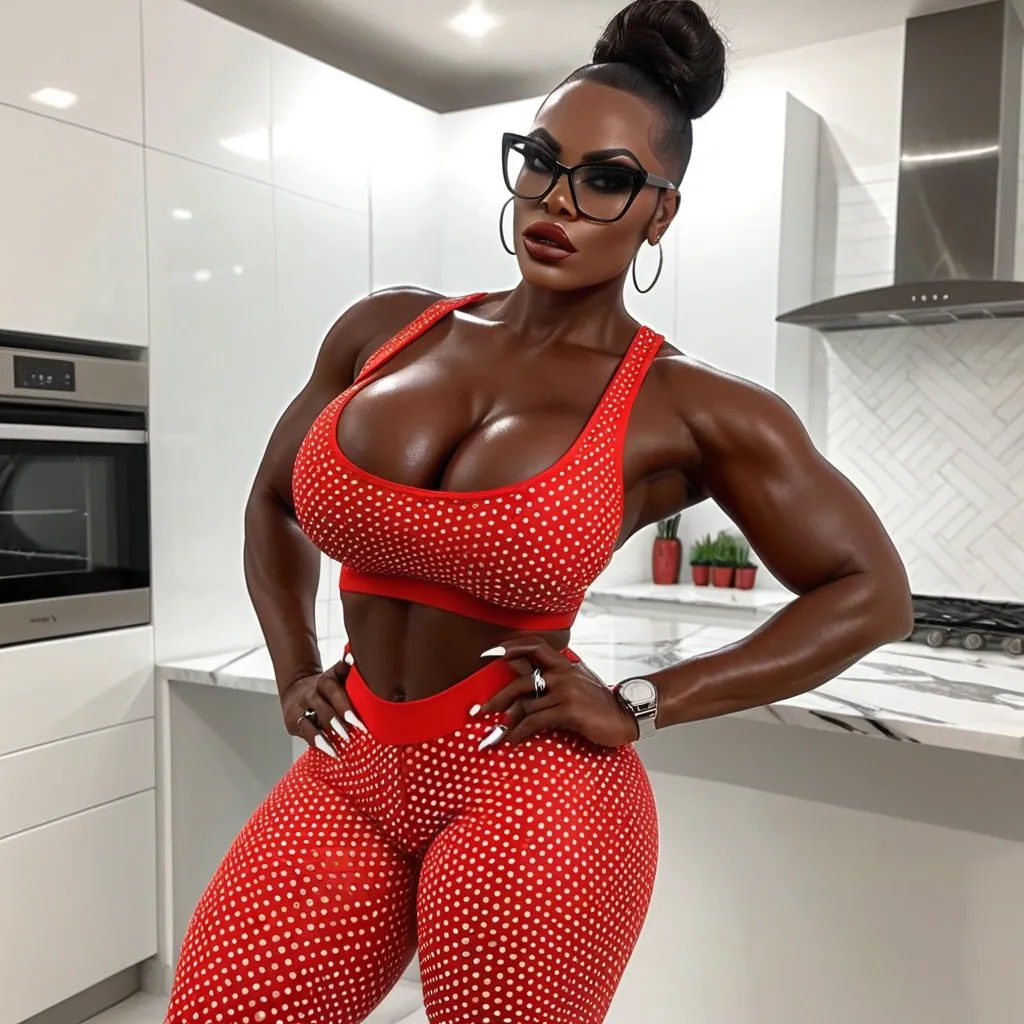 Generate Gorgeous female boss , bimbo , eye glasses , very dark-skinned African-American woman , very big lips , hourglass body , abnormally massive female bodybuilder , gorgeous , close up , full lips , big booty , brown hair , short pixie hair , feminine silhouette , too big breast , big booty , sexy thighs abs , silhouette , up close , flexing biceps , beautiful brown eyes , legs are iconic and defining physical feature , both visually and in terms of combat ability.wearing an outfit that is a striking blend of elegance , power , and femininity , designed to command attention in any room. The suit is tailored to perfection , hugging the wearer’s curves with precision while emphasizing a structured silhouette. The fabric itself is a refined grey tweed patterned with subtle white grid lines , giving the suit a texture that feels both sophisticated and modern. The blazer features broad blue lapels and gold button accents , adding a luxurious touch that elevates the look beyond typical business attire. The matching high-waisted trousers elongate the frame , further enhancing the poised and commanding effect of the ensemble.The styling choices amplify the boldness of the suit. The inner blouse is a silky , greybutton-down shirt that complements the tweed’s tone while introducing a softer , feminine balance to the sharp tailoring of the jacket. The blouse peeks out neatly from under the blazer , maintaining elegance without drawing focus away from the suit’s commanding cut. Accessories are kept minimal yet intentional: a delicate layered gold necklace and hoop earrings that add glimmers of light and luxury without overpowering the outfit. The choice of voluminous , honey-brown braids cascading down her shoulders frames the face with both confidence and glamour , completing the commanding visual.Altogether , this look communicates a blend of authority and allure. It is business-ready yet fashion-forward , balancing corporate structure with vibrant femininity. The color palette blue , grey and gold avoids being overly delicate , instead embracing the richness of texture , structure , and presence. This is the kind of ensemble that speaks to ambition , sophistication , and personal style—ideal for someone who thrives in positions of influence but insists on expressing her individuality with bold elegance. It’s not just clothing—it’s a statement of power wrapped in grace. In luxury living legs that could crush a watermelon , skirt high boots are a bold and striking statement piece , crafted in glossy black patent leather that gives them a sleek , polished finish. Rising to just below the knee , the boots feature three adjustable buckle straps along the shaft , adding both edge and detail to their design. The towering stiletto heel , paired with a thick platform sole , creates an ultra-dramatic silhouette that elongates the leg and exudes power and confidence. With their combination of shine , height , and structure , these boots perfectly balance fierce femininity with high-fashion allure. High cheekbones , prominent jawline , gorgeous big brown eyes , , enormous breast , red and white pin-dot tank top , white pants , enormous butt , powerful hips , in the the kitchen , long dress ,