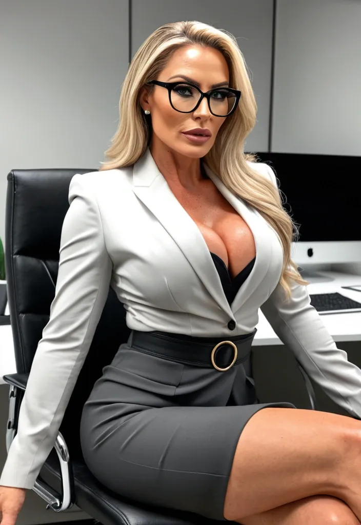 Generate Gorgeous female boss , too big breast , wearing eye glasses , stacked , enormous breast , Caucasian woman , blonde , freckles , 34 years old , strong jawline , prominent facial features , gorgeous , close up , full lips , big booty , blonde , hair , feminine silhouette , beautiful blue eyes , 1940s hairstyle , big booty , curvy hips , toned legs , legs that could crush a watermelon , up facing the camera , She’s wearing a modest top , , long , elegant floral-patterned dress paired with a white , yellow and blue-colored buttoned cardigan , giving her a soft , cozy , bohemian feminine style. , enormous butt , sitting in boss office The suit is tailored to perfection , hugging the wearer’s curves with precision while emphasizing a structured silhouette. The fabric itself is a refined grey tweed patterned with subtle white grid lines , giving the suit a texture that feels both sophisticated and modern. The blazer features broad blue lapels and gold button accents , adding a luxurious touch that elevates the look beyond typical business attire. The matching high-waisted trousers elongate the frame , further enhancing the poised and commanding effect of the ensemble.The styling choices amplify the boldness of the suit. The inner blouse is a silky , greybutton-down shirt that complements the tweed’s tone while introducing a softer , feminine balance to the sharp tailoring of the jacket. The blouse peeks out neatly from under the blazer , maintaining elegance without drawing focus away from the suit’s commanding cut. Accessories are kept minimal yet intentional: a delicate layered gold necklace and hoop earrings that add glimmers of light and luxury without overpowering the outfit. The choice of voluminous , honey-brown braids cascading down her shoulders frames the face with both confidence and glamour , completing the commanding visual.Altogether , this look communicates a blend of authority and allure. It is business-ready yet fashion-forward , balancing corporate structure with vibrant femininity. The color palette blue , grey and gold avoids being overly delicate , instead embracing the richness of texture , structure , and presence. This is the kind of ensemble that speaks to ambition , sophistication , and personal style—ideal for someone who thrives in positions of influence but insists on expressing her individuality with bold elegance. It’s not just clothing—it’s a statement of power wrapped in grace. In luxury living legs that could crush a watermelon , skirt high boots are a bold and striking statement piece , crafted in glossy black patent leather that gives them a sleek , polished finish. Rising to just below the knee , the boots feature three adjustable buckle straps along the shaft , adding both edge and detail to their design. The towering stiletto heel , paired with a thick platform sole , creates an ultra-dramatic silhouette that elongates the leg and exudes power and confidence. With their combination of shine , height , and structure , these boots perfectly balance fierce femininity with high-fashion allure. High cheekbones , prominent jawline , gorgeous big brown eyes , enormous breast , enormous butt seated back in her office chair with one iron-forged leg crossed over the other , she radiates calm dominance , elegance , and the unmistakable presence of a dominant woman , wearing gray blazer and black skirt , and white blouse in a oiffce ,