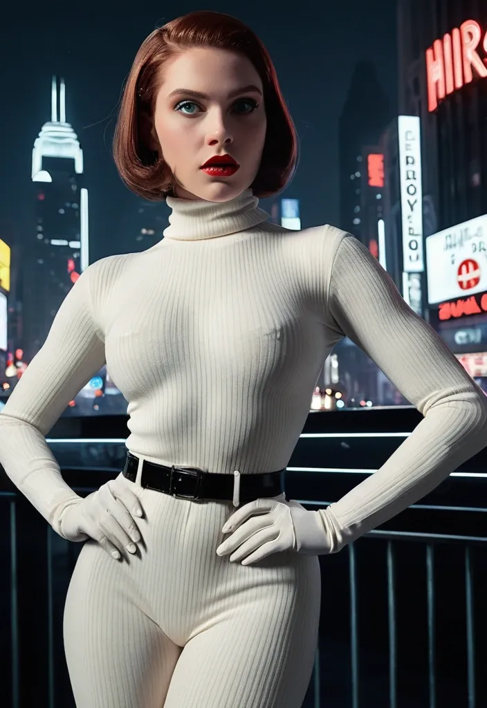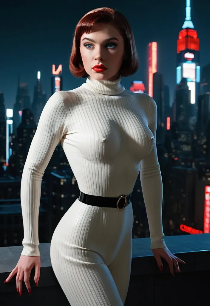 Ruby Fierce (Age 24) — Canon ProfileRuby Fierce is a stunning Caucasian woman whose presence commands any room she enters. Her short , sleek bob-cut brown hair frames a perfectly sculpted V-shaped face , while her icy blue eyes seem almost electric under cinematic lighting — sharp , intelligent , and unyielding. Her dimples soften her confident demeanor just enough to remind onlookers she’s human , not an untouchable legend.She wears a form-fitted ivory ribbed turtleneck , emphasizing her athletic yet feminine silhouette — a balance of grace and power that embodies Dream City’s 1940s-futuristic aesthetic. Her bold eyeliner and glossy red lips accentuate her expressions with precision; nothing about Ruby is accidental. Every glance , every line , every choice in her look is deliberate and controlled.Ruby moves and speaks with quiet authority — not loud , but undeniable. Her confidence is forged , not flaunted. In the glare of Dream City’s neon skyline , she stands as the sharp mind beside Click Fierce , the woman whose intuition keeps the Shadows one step ahead of chaos. She is beauty sharpened into brilliance — powerful , poised , and profoundly fierce. Enormous butt , enormous breast , hourglass body ,