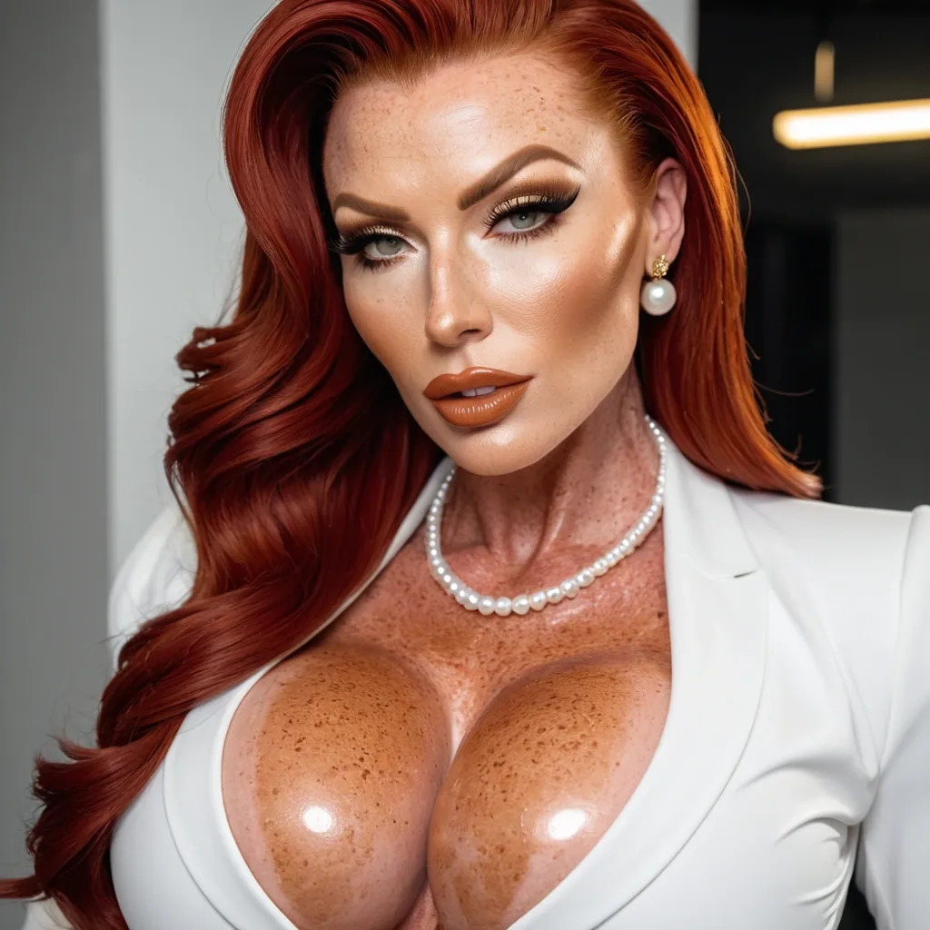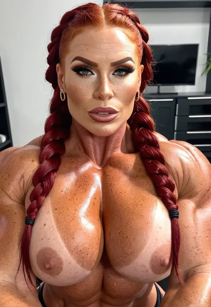 Generate Gorgeous female boss , bimbo , hourglass body , abnormally massive female bodybuilder , gorgeous , close up , full lips , big booty , redheaded , freckles on face and breast , braided design hair , feminine silhouette , too big breast , big booty , sexy thighs abs , silhouette , up close , flexing biceps , beautiful green eyes , legs are iconic and defining physical feature , both visually and in terms of combat ability.wearing an outfit that is a striking blend of elegance , power , and femininity , designed to command attention in any room. The suit is tailored to perfection , hugging the wearer’s curves with precision while emphasizing a structured silhouette. The fabric itself is a refined grey tweed patterned with subtle white grid lines , giving the suit a texture that feels both sophisticated and modern. The blazer features broad blue lapels and gold button accents , adding a luxurious touch that elevates the look beyond typical business attire. The matching high-waisted trousers elongate the frame , further enhancing the poised and commanding effect of the ensemble.The styling choices amplify the boldness of the suit. The inner blouse is a silky , greybutton-down shirt that complements the tweed’s tone while introducing a softer , feminine balance to the sharp tailoring of the jacket. The blouse peeks out neatly from under the blazer , maintaining elegance without drawing focus away from the suit’s commanding cut. Accessories are kept minimal yet intentional: a delicate layered gold necklace and hoop earrings that add glimmers of light and luxury without overpowering the outfit. The choice of voluminous , honey-brown braids cascading down her shoulders frames the face with both confidence and glamour , completing the commanding visual.Altogether , this look communicates a blend of authority and allure. It is business-ready yet fashion-forward , balancing corporate structure with vibrant femininity. The color palette blue , grey and gold avoids being overly delicate , instead embracing the richness of texture , structure , and presence. This is the kind of ensemble that speaks to ambition , sophistication , and personal style—ideal for someone who thrives in positions of influence but insists on expressing her individuality with bold elegance. It’s not just clothing—it’s a statement of power wrapped in grace. In luxury living legs that could crush a watermelon , skirt high boots are a bold and striking statement piece , crafted in glossy black patent leather that gives them a sleek , polished finish. Rising to just below the knee , the boots feature three adjustable buckle straps along the shaft , adding both edge and detail to their design. The towering stiletto heel , paired with a thick platform sole , creates an ultra-dramatic silhouette that elongates the leg and exudes power and confidence. With their combination of shine , height , and structure , these boots perfectly balance fierce femininity with high-fashion allure.Generate Gorgeous female boss , bimbo , hourglass body , abnormally massive female bodybuilder , gorgeous , close up , full lips , big booty , redheaded , freckles on face and breast , braided design hair , feminine silhouette , too big breast , big booty , sexy thighs abs , silhouette , up close , flexing biceps , beautiful green eyes , legs are iconic and defining physical feature , both visually and in terms of combat ability.wearing an outfit that is a striking blend of elegance , power , and femininity , designed to command attention in any room. The suit is tailored to perfection , hugging the wearer’s curves with precision while emphasizing a structured silhouette. The fabric itself is a refined grey tweed patterned with subtle white grid lines , giving the suit a texture that feels both sophisticated and modern. The blazer features broad blue lapels and gold button accents , adding a luxurious touch that elevates the look beyond typical business attire. The matching high-waisted trousers elongate the frame , further enhancing the poised and commanding effect of the ensemble.The styling choices amplify the boldness of the suit. The inner blouse is a silky , greybutton-down shirt that complements the tweed’s tone while introducing a softer , feminine balance to the sharp tailoring of the jacket. The blouse peeks out neatly from under the blazer , maintaining elegance without drawing focus away from the suit’s commanding cut. Accessories are kept minimal yet intentional: a delicate layered gold necklace and hoop earrings that add glimmers of light and luxury without overpowering the outfit. The choice of voluminous , honey-brown braids cascading down her shoulders frames the face with both confidence and glamour , completing the commanding visual.Altogether , this look communicates a blend of authority and allure. It is business-ready yet fashion-forward , balancing corporate structure with vibrant femininity. The color palette blue , grey and gold avoids being overly delicate , instead embracing the richness of texture , structure , and presence. This is the kind of ensemble that speaks to ambition , sophistication , and personal style—ideal for someone who thrives in positions of influence but insists on expressing her individuality with bold elegance. It’s not just clothing—it’s a statement of power wrapped in grace. In luxury living legs that could crush a watermelon , skirt high boots are a bold and striking statement piece , crafted in glossy black patent leather that gives them a sleek , polished finish. Rising to just below the knee , the boots feature three adjustable buckle straps along the shaft , adding both edge and detail to their design. The towering stiletto heel , paired with a thick platform sole , creates an ultra-dramatic silhouette that elongates the leg and exudes power and confidence. With their combination of shine , height , and structure , these boots perfectly balance fierce femininity with 