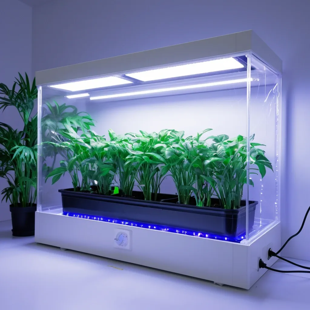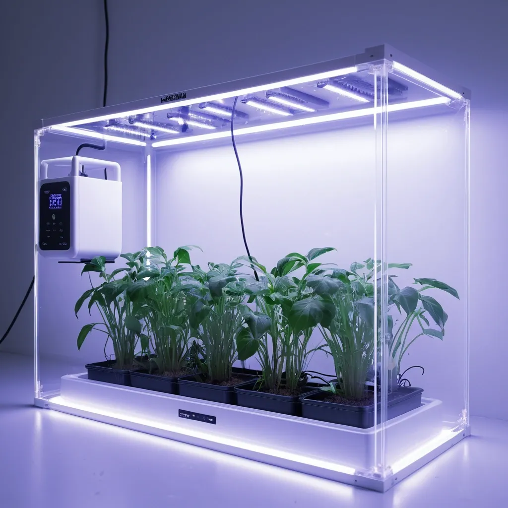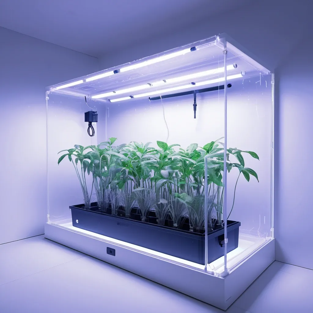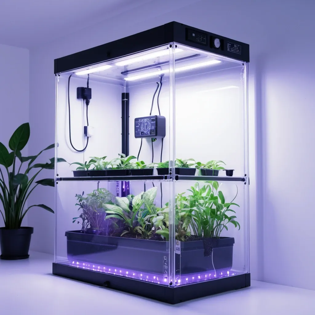 Photorealistic image of a rectangular plastic grow box for indoor plants , size 40cm width , 40cm height , 120cm length , sealed controlled environment with own atmosphere , transparent front acrylic lid fully visible , inside lush green plants growing under LED grow lights , white plastic walls , ventilation fans , hygrometer and thermometer on the side , hydroponic system with water and nutrients , soft blue-purple LED glow from inside , modern minimalistic design , front view , high detail , 8k resolution ,